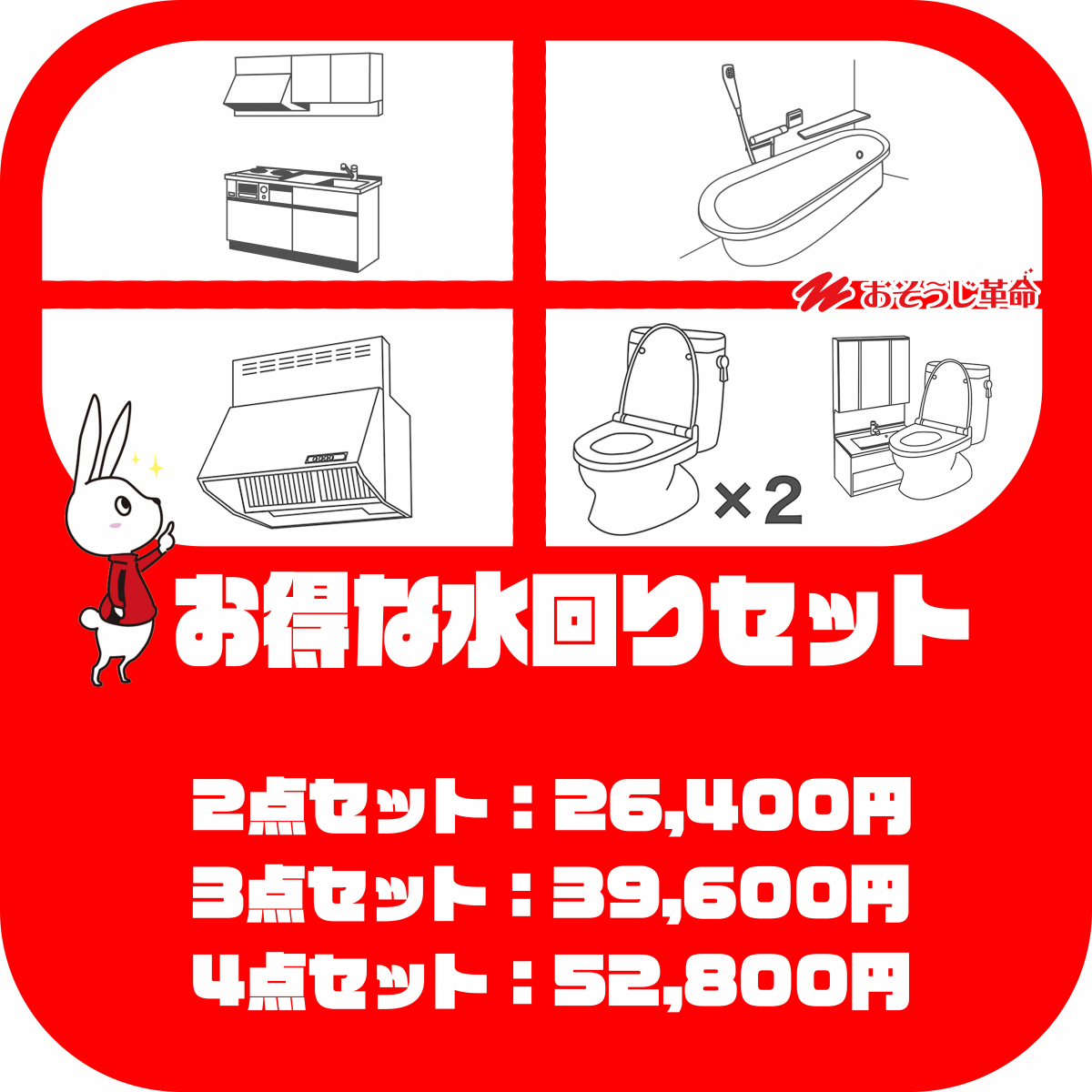 水回りは、2点セット、3点セット、4点セットがあり、