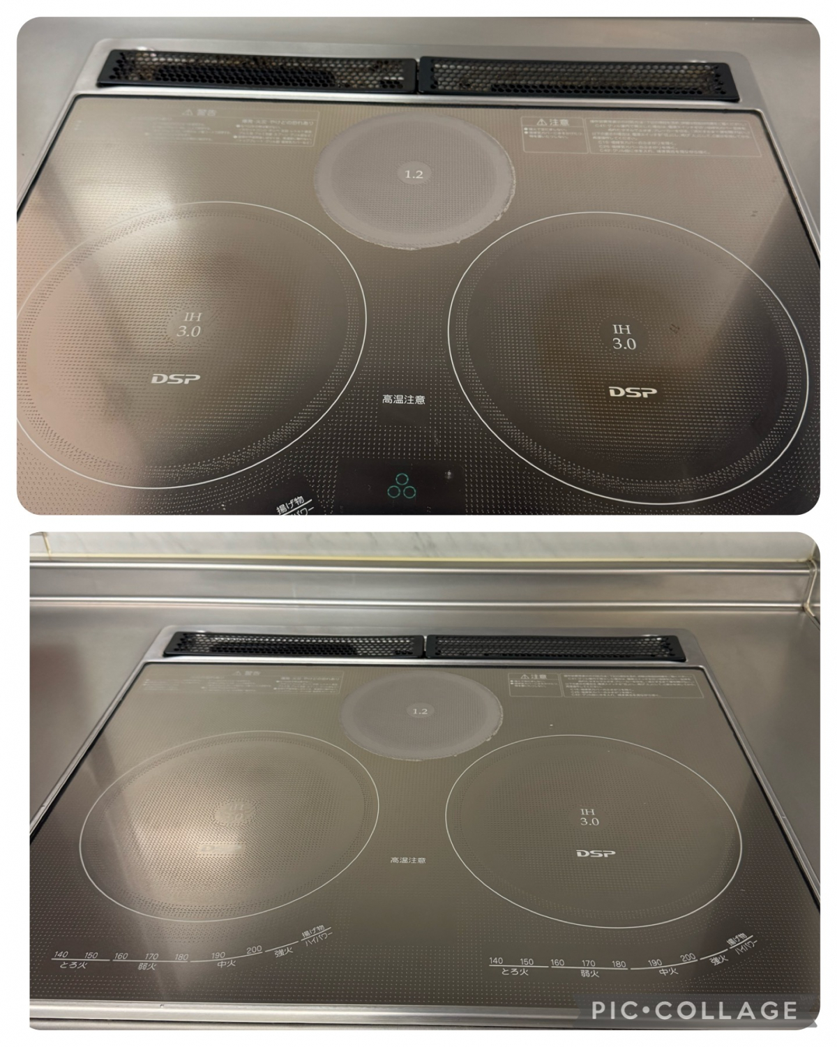 基本的には、IHのトッププレートはガラスでできていることがほとんどなので、傷がつきにくく、汚れも油汚れがほとんどですので、アルカリ性の薬剤を使用して中和して落としていきます。汚れが固いからといって、ガリガリ削ってしまうと、トッププレートに傷が付き、故障の原因にもなりかねませんので、ご注意下さい。