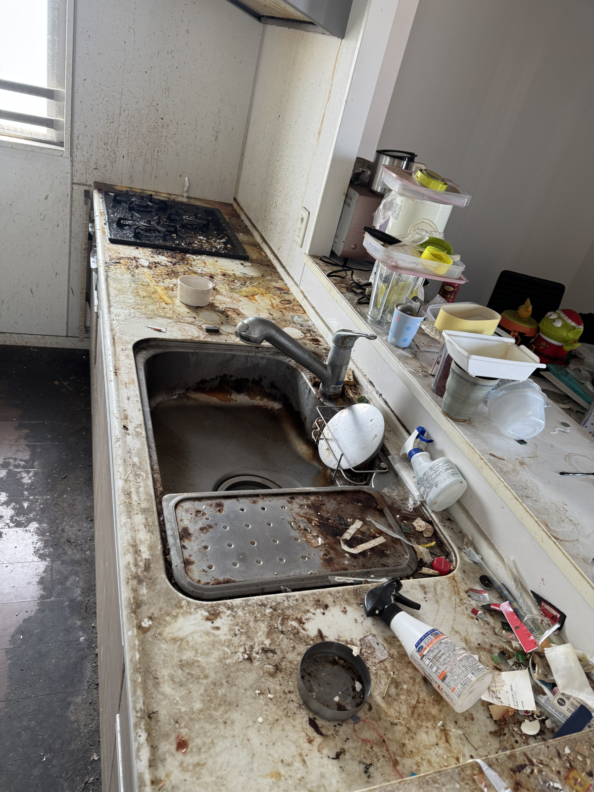 さすがにこのままではまずいとおもい、当店にご連絡いただきました。現地にて汚れ具合や清掃範囲をご相談させていただき、ゴミの撤去作業も含め作業させていただきました。
