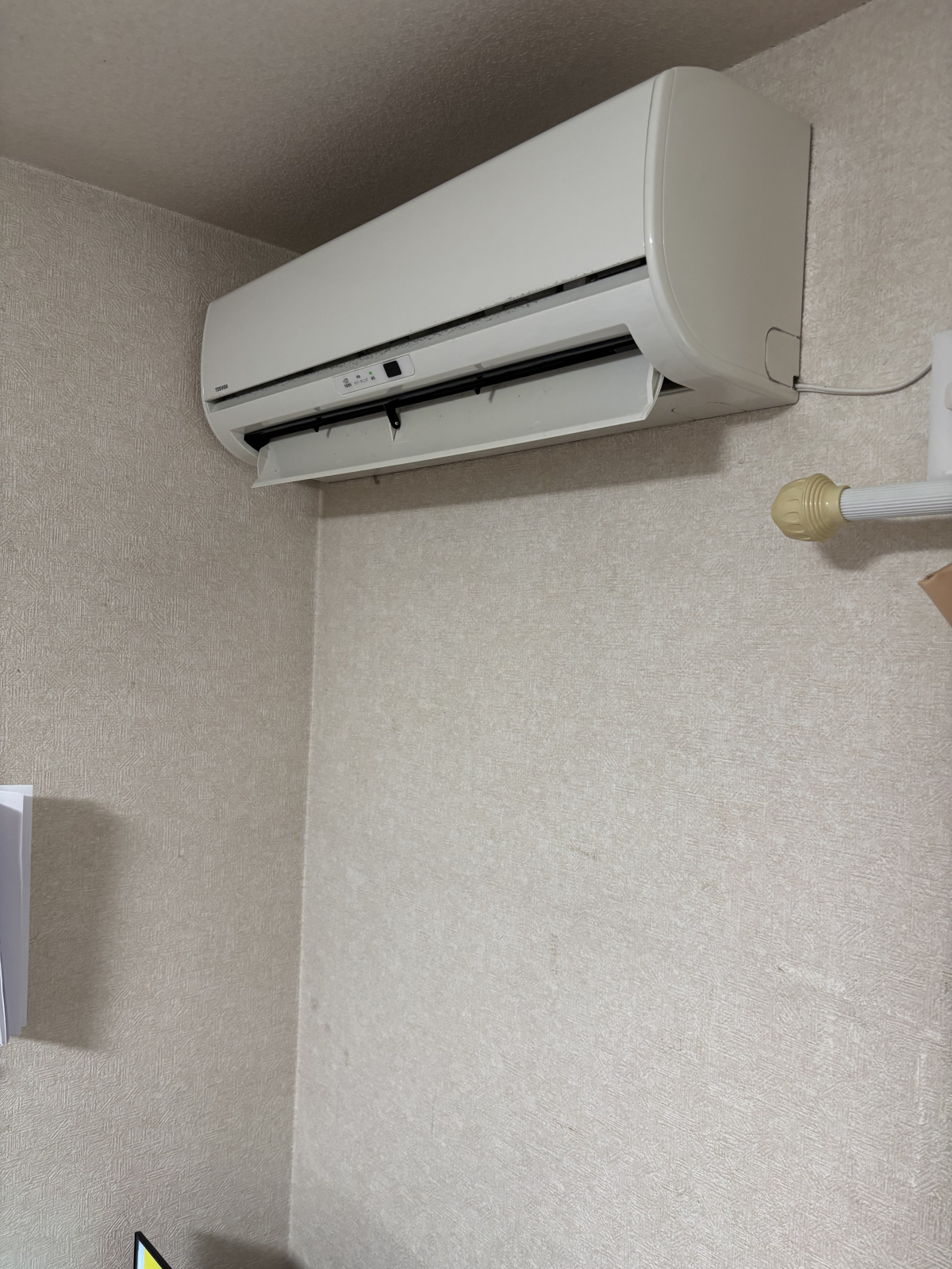 エアコンは壁左寄りで下にはテレビ、周辺に物もある状況でしたので、物移動と周辺養生は丁寧に実施。