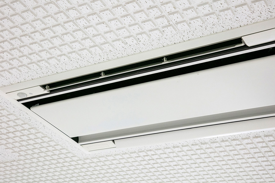 - エアコン本体が天井に埋め込まれており、室内から見えるのは正方形または長方形のパネルだけ。