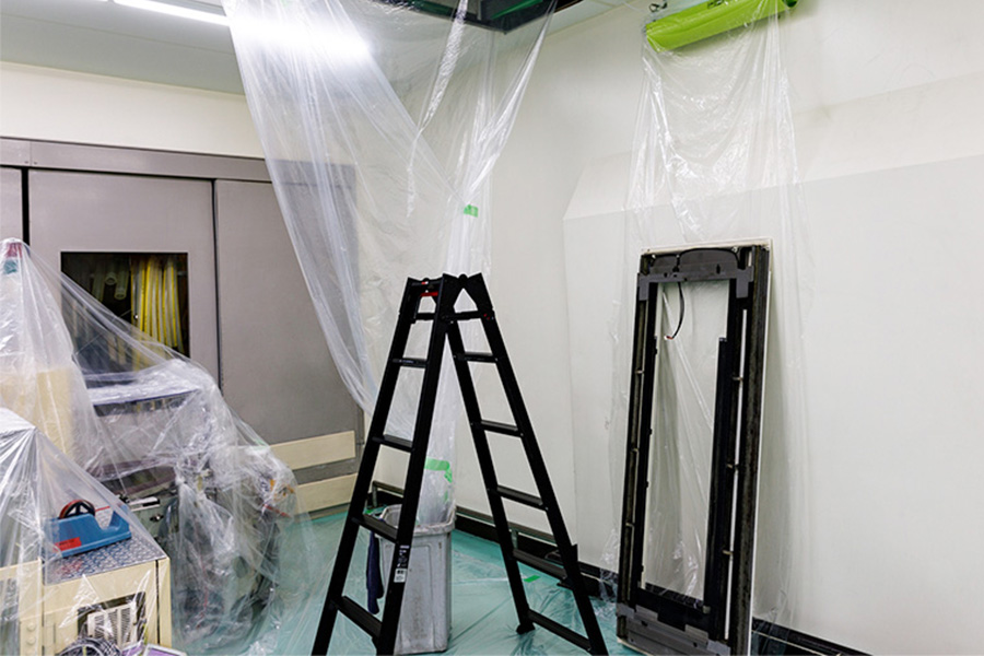 洗浄液や汚れが周囲に飛び散らないよう、本体および機械部分を養生シートでしっかり保護します。