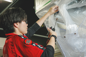 エアコン周辺の壁、床などに養生シートを敷き、周辺を汚さないよう万全の準備をします。