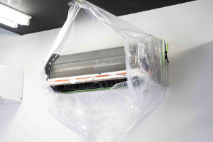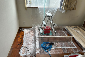 エアコン周辺の壁、床などに養生シートを敷き、周辺を汚さないよう万全の準備をします。