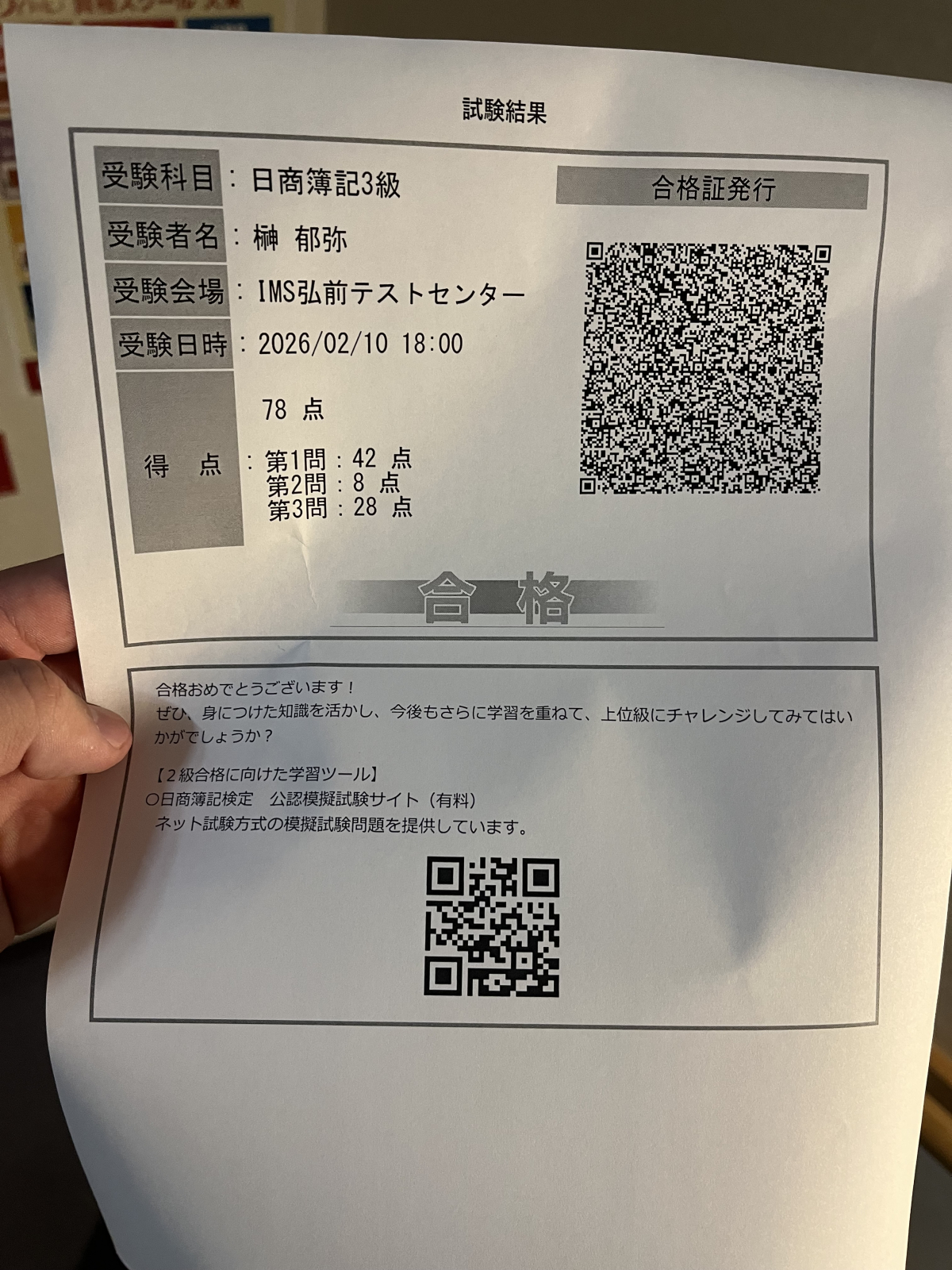 本日、日商簿記3級を受検してきて、なんと1発合格できました!