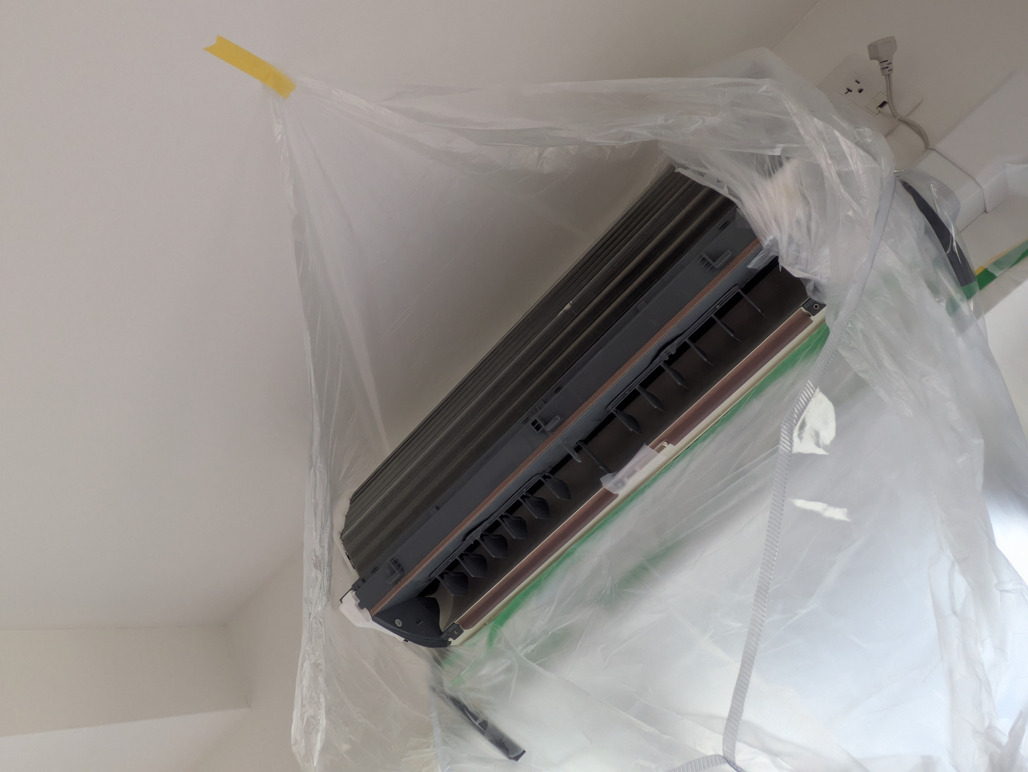 作業前に動作を確認し、周囲を養生で保護します。その後ドライバーでネジを外し、高圧洗浄できるようエアコンを分解していきます。