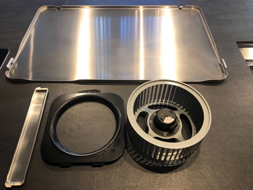 分解してみるとファンやフィルターにはベタベタの油汚れがびっしり…。