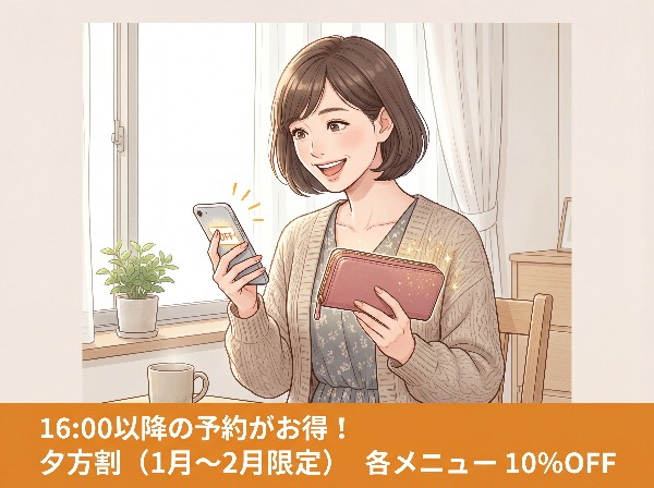 「夕方割」を用意しました! 16:00以降の予約で各メニュー10%OFF(1月〜2月限定)。