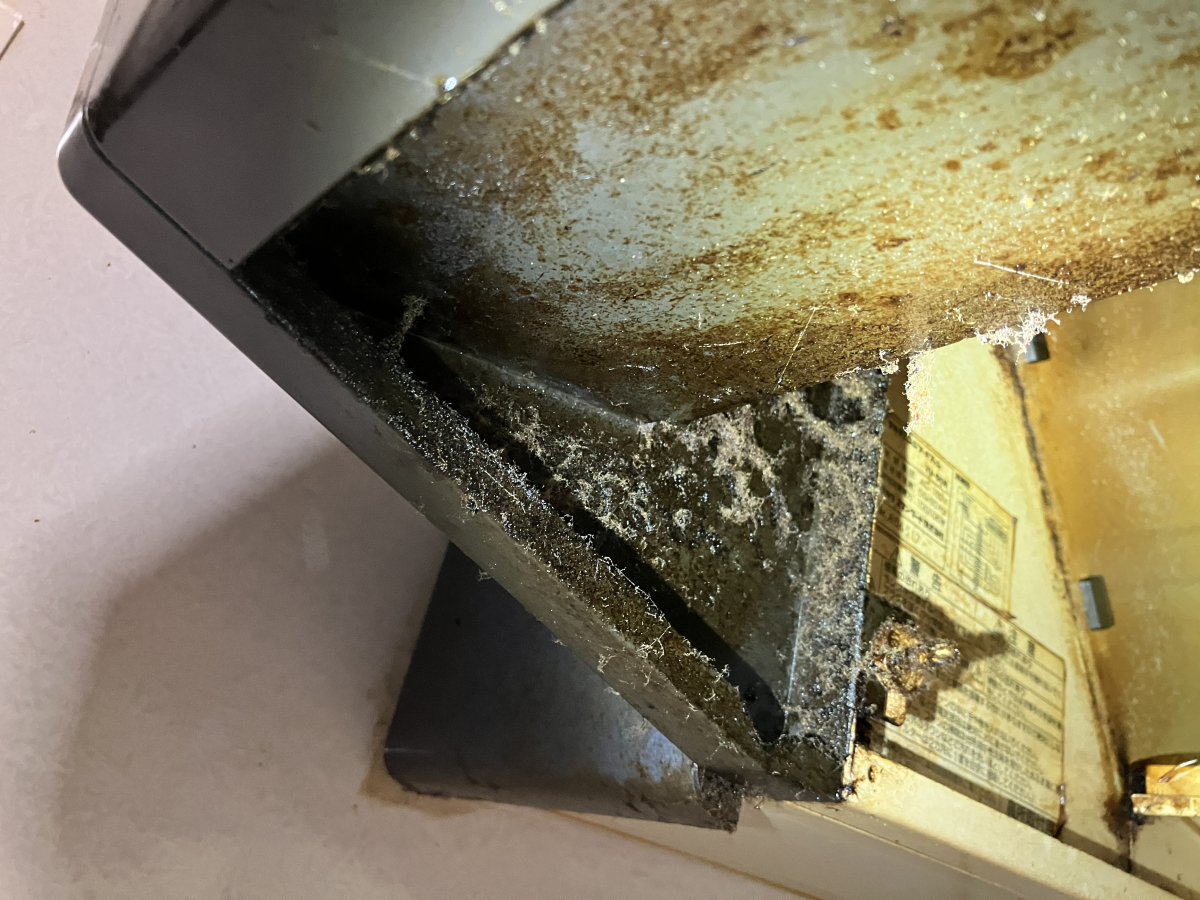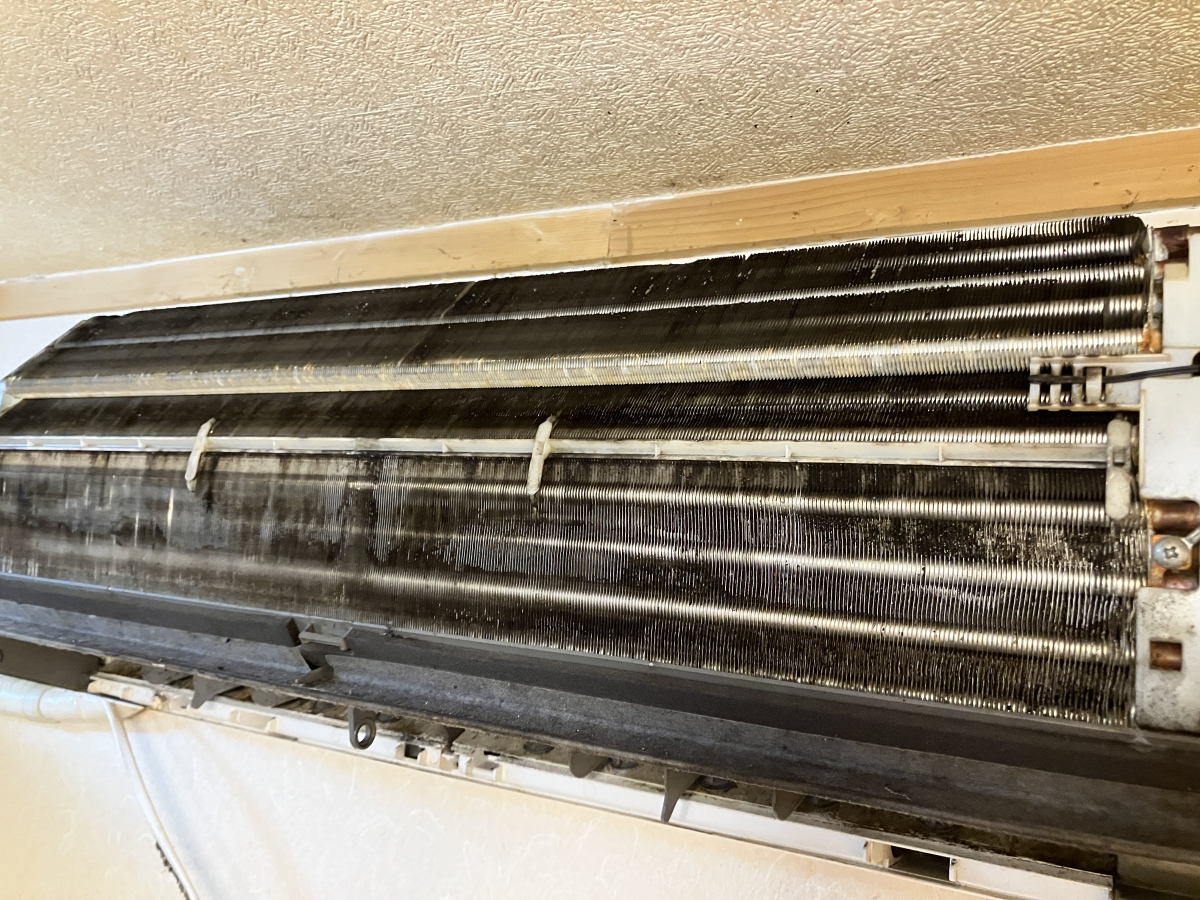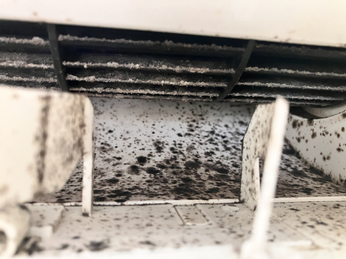 外から見るときれいでも、エアコン内部の送風ファンや熱交換器にはホコリやカビが溜まりやすい場所です。特にエアコンクリーニングを数年間していない場合、黒カビが広がっているケースも珍しくありません。運転したときに嫌な臭いがする場合は、内部の汚れが原因の可能性が高いですね!
