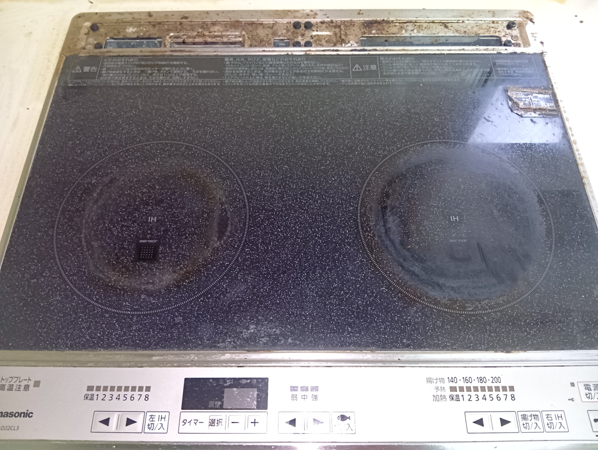 4. 焦げ付き・食品汚れ:ガスコンロやグリルの焦げ、調味料の飛び散りなどが酸化・炭化して落ちにくくなります。