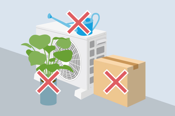 段ボールや植木鉢などを置くと空気の流れが悪くなり、熱を逃がせなくなります。周囲はスッキリと片付けて風通しを確保しましょう。