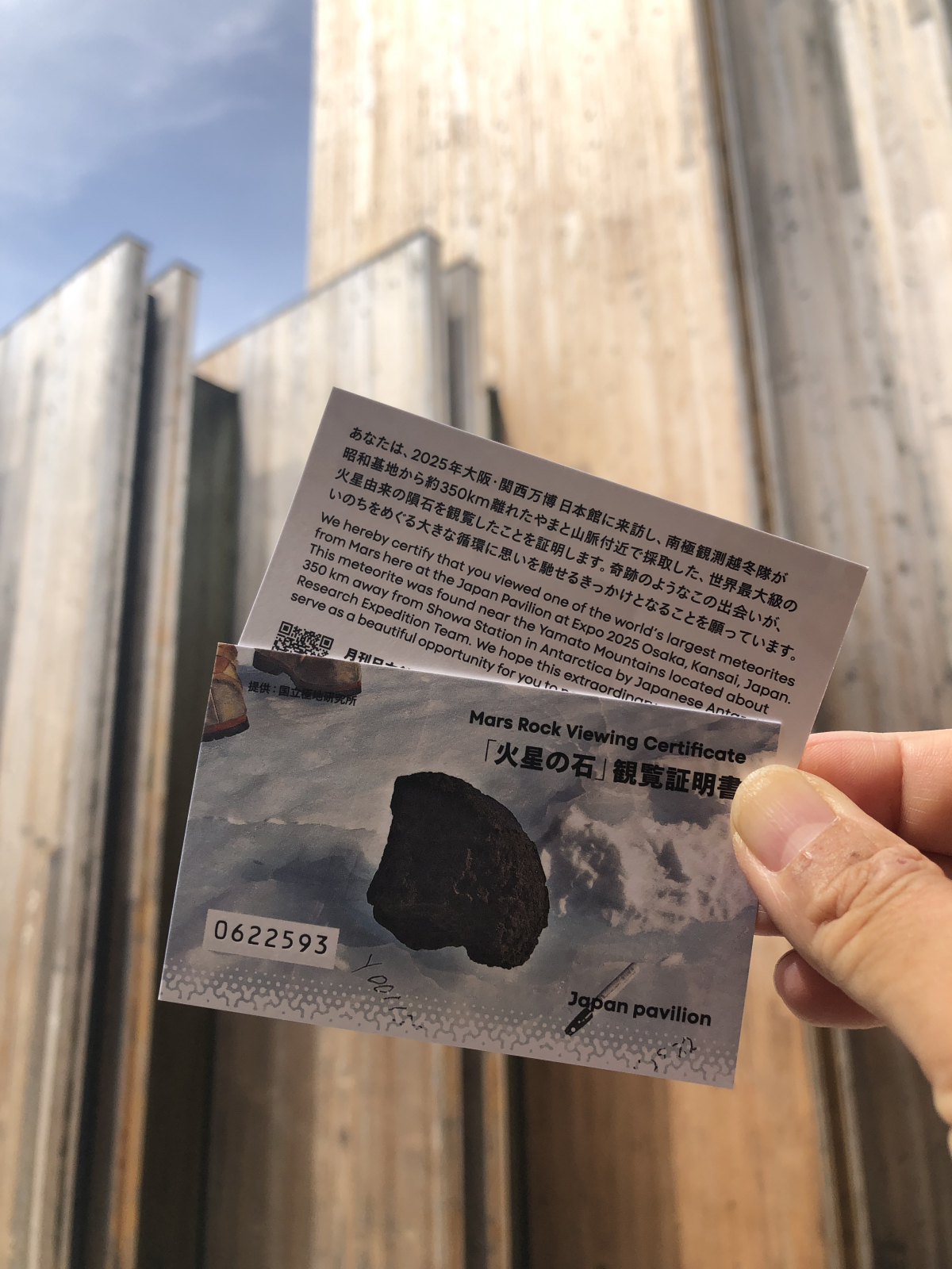 日本館では、生ごみを利用したバイオガス発電の仕組みが紹介されており、環境への取り組みを間近に知ることができました。また、展示されていた「火星の石」に実際に触れる体験は、とても貴重で印象的でした。