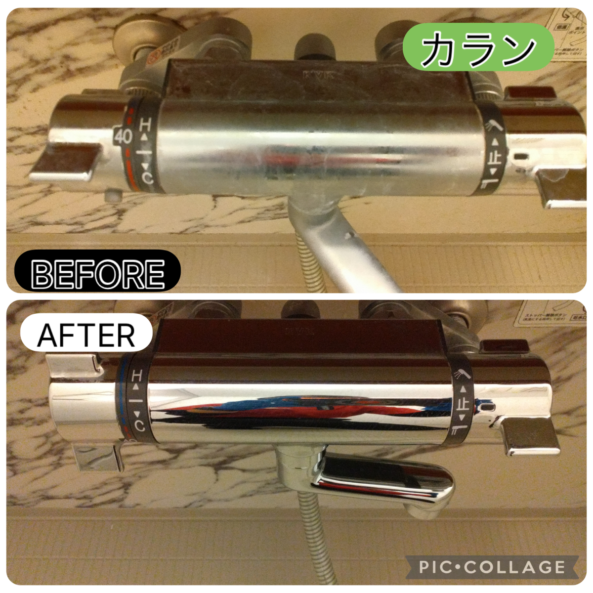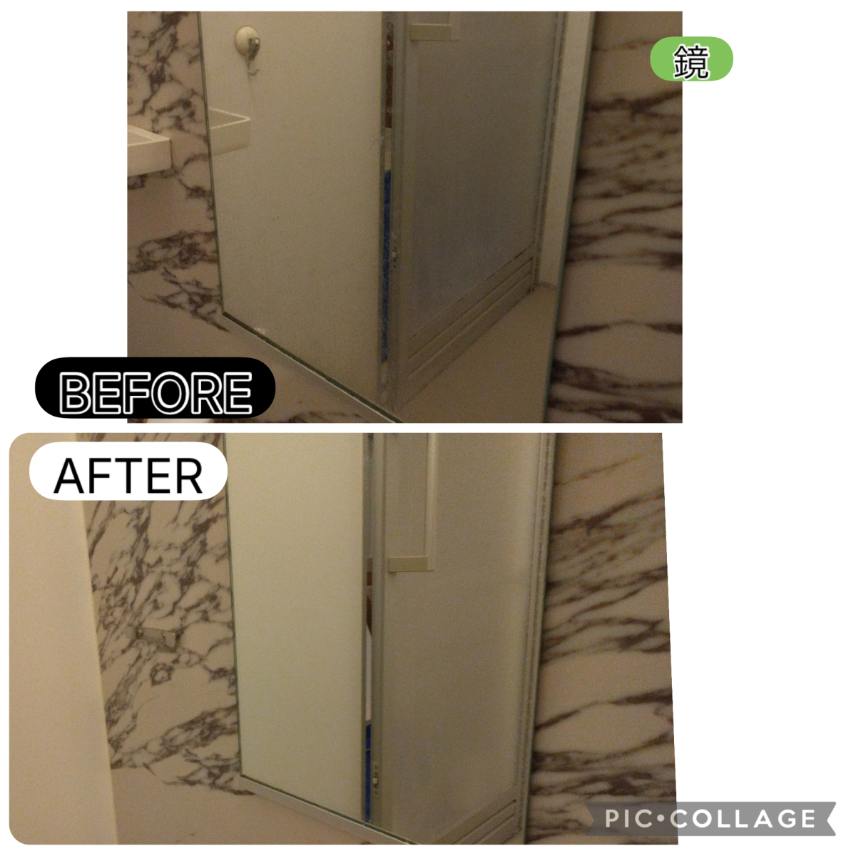 続いて鏡の水垢除去。白く曇ってしまいがちな鏡は、放置すると固着してしまい家庭用洗剤ではなかなか落とせません。専用の研磨材と機材を使い、曇りが取れ、クリアな視界が戻りました。