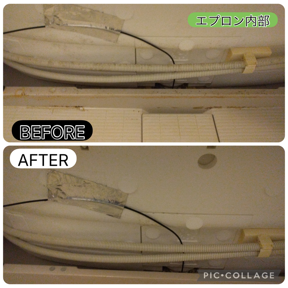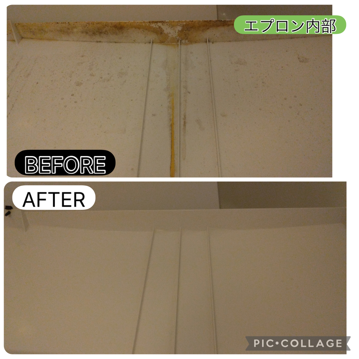 まずは、外側からでは見えないエプロン内部。湿気がこもりやすく、カビや石鹸カスが溜まりやすい箇所ですが、専用の薬剤と道具を使ってしっかり分解洗浄。内部に付着していた汚れもスッキリ落ち、見違えるほどKIREIに仕上がりました。