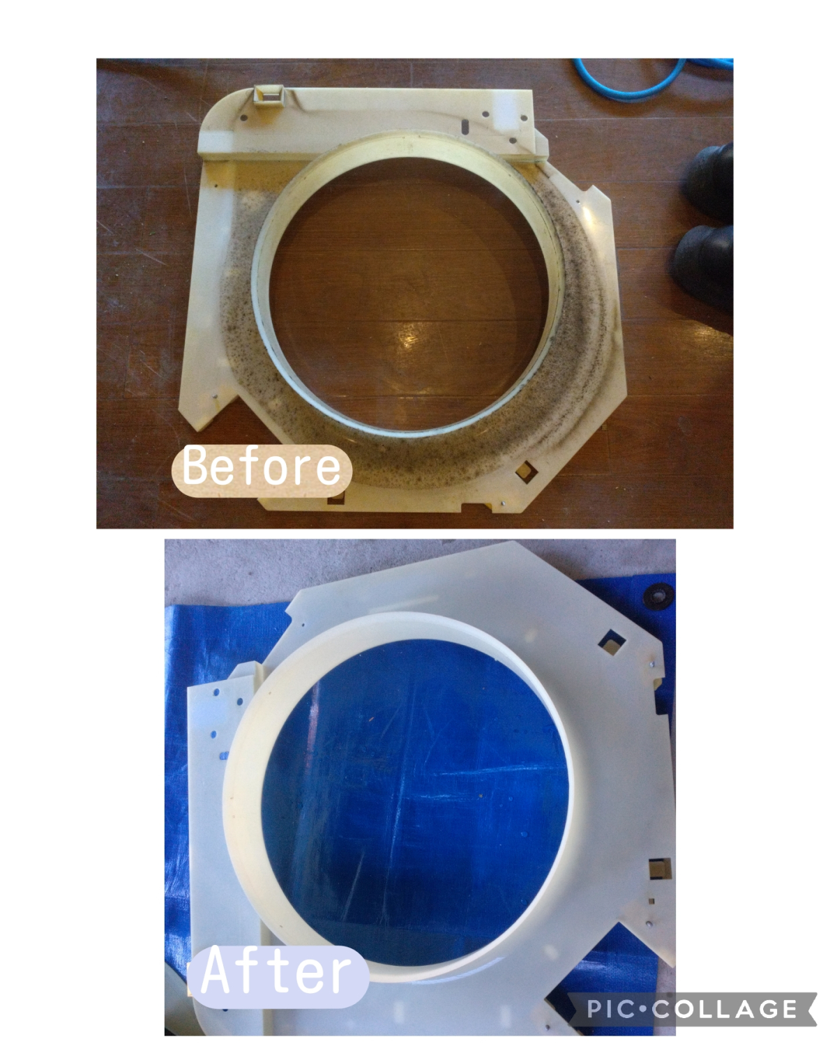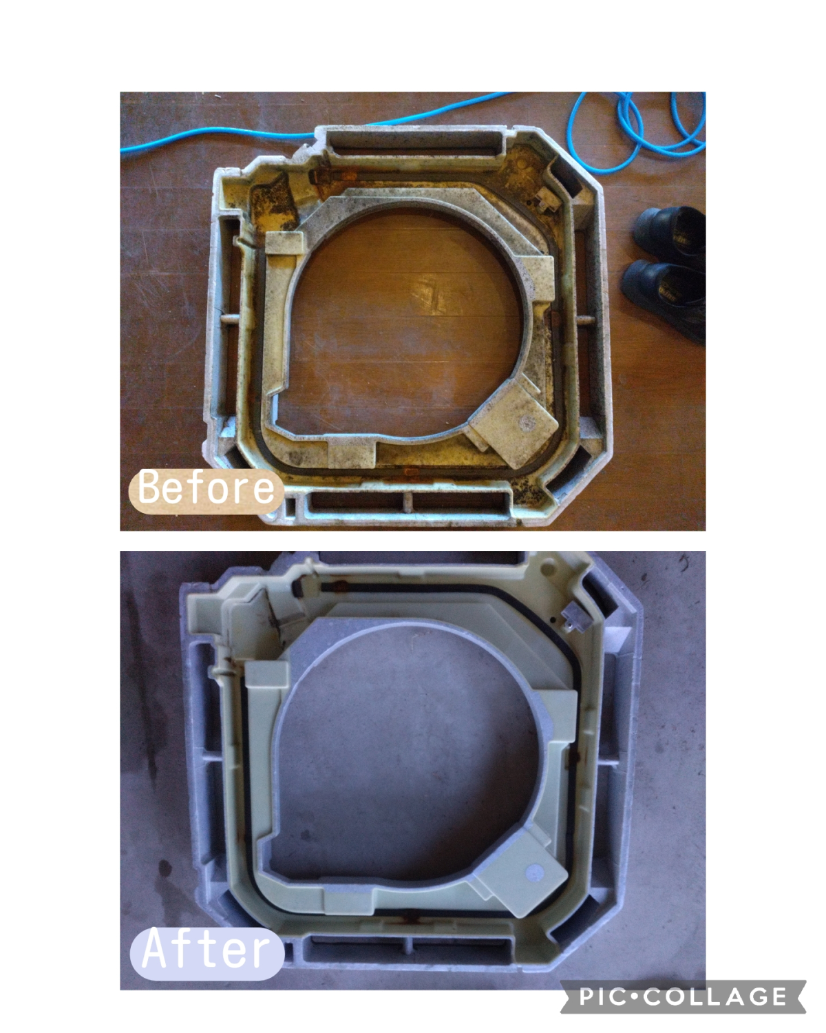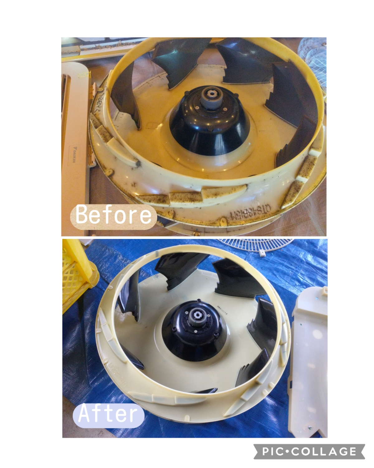 当日は妻と二人で作業を分担し、それぞれのエアコンに集中して取り組みました。内部を確認すると、どのエアコンもカビ汚れが非常に強く、長期間使用されていたことが分かる状態でした。分解後は、エアコン専用の薬剤を使用し、熱交換器や送風ファン、カバー類まで丁寧に洗浄していきました。