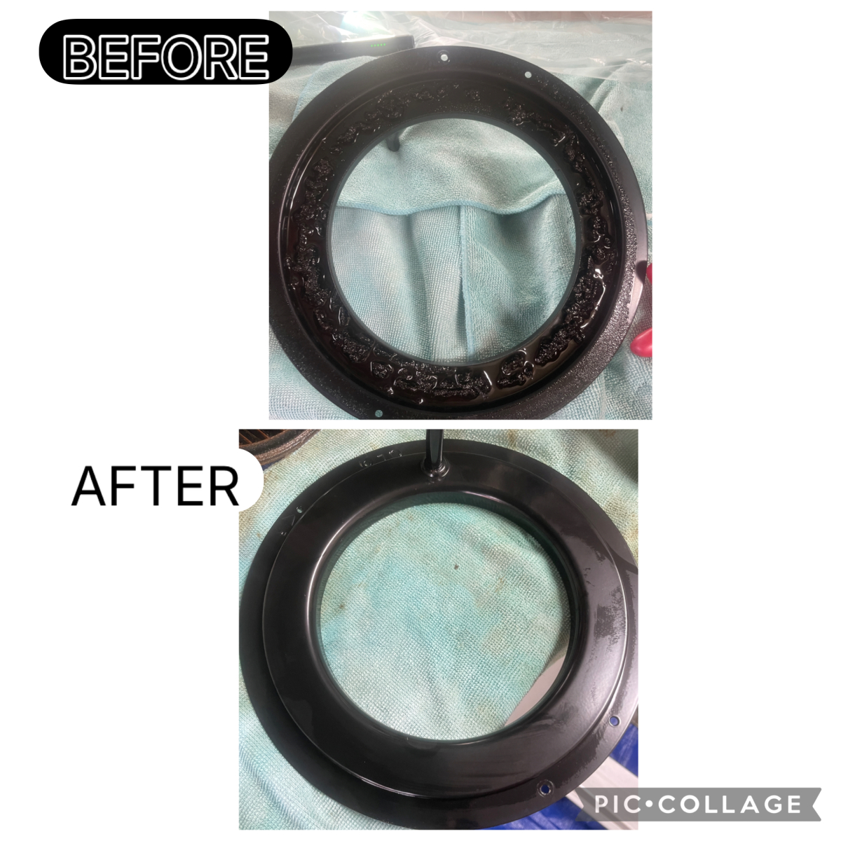 まずは養生を丁寧に行い、油跳ねや壁面への影響を防ぎながら分解作業を開始。フィルター・内部カバー・シロッコファンまで取り外し、専用薬剤を使用して、こびり付いた油汚れをしっかり分解していきました。特にシロッコファンの汚れは重度で、浸け置きを行いながら時間をかけて除去。作業時間は通常より長くなりましたが、最終的に内部までKIREIに仕上げることができました。