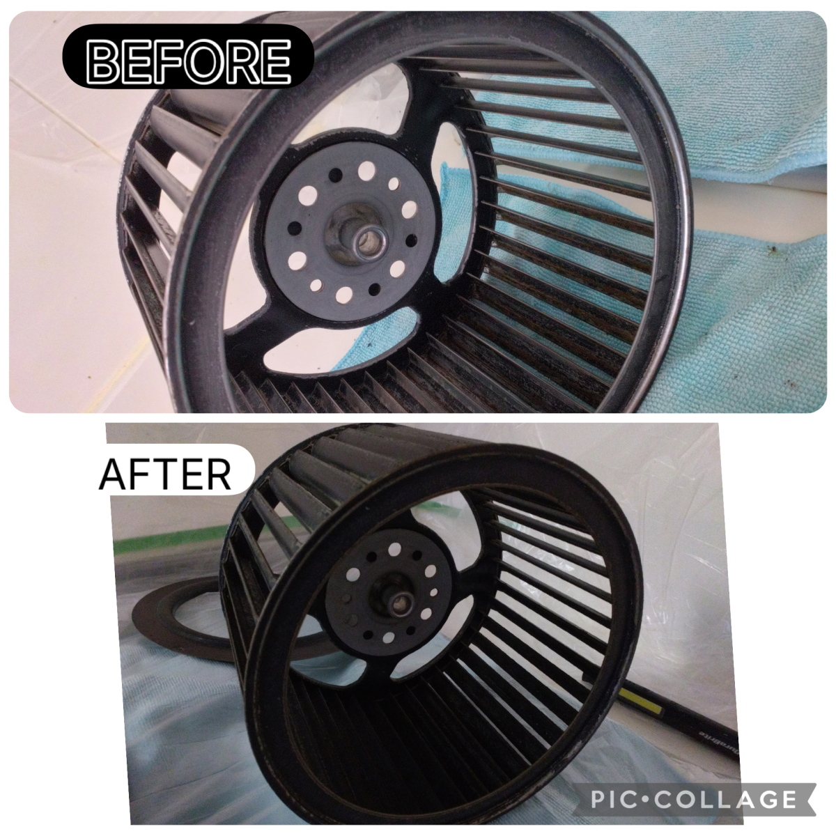 ファンの裏側やつなぎ目など、普段のお掃除では手が届きにくい部分には、少しずつ蓄積した油汚れが見られました。素材を傷めないよう注意しながら、丁寧に油汚れを除去していきます。