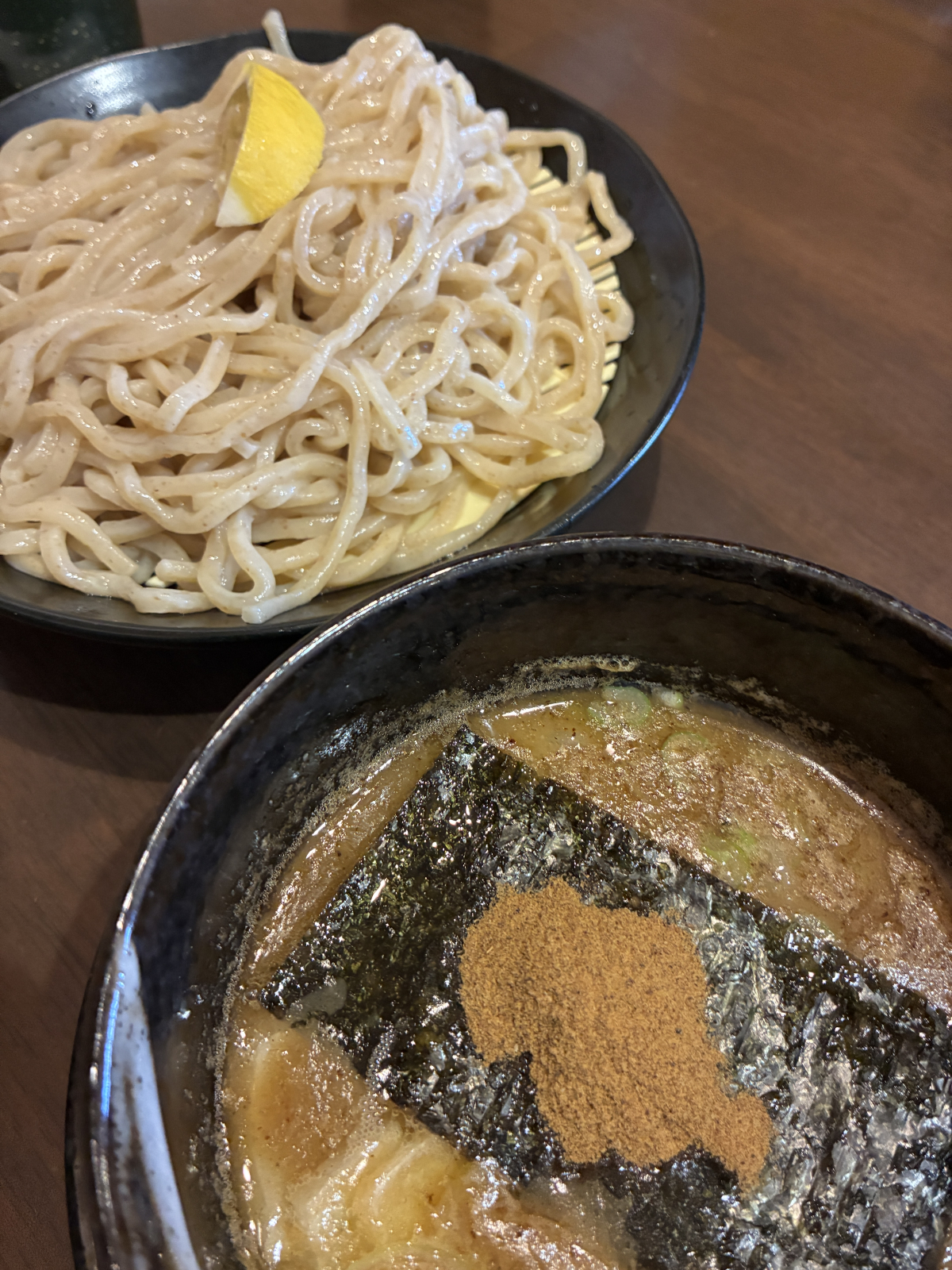 妻が注文したつけ麺は、濃厚なスープが太麺にしっかり絡むタイプで、食べ応えがあり「美味しい!」と満足そうな表情。