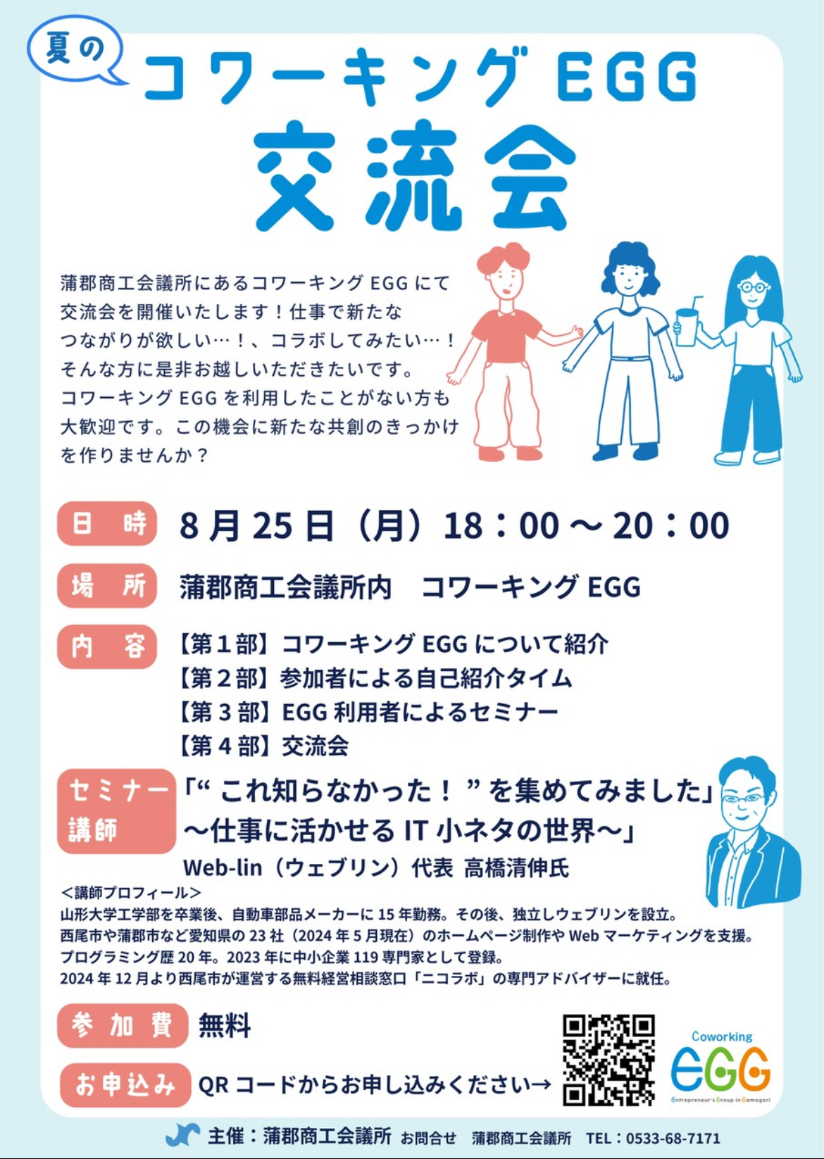商工会議所主催の「夏のコワーキングEGG交流会」に参加してきました。 この交流会は、さまざまな業種の方が集まり、お互いに情報交換をしたり、新しい人脈を広げる場として開催されたものです。 実際に...