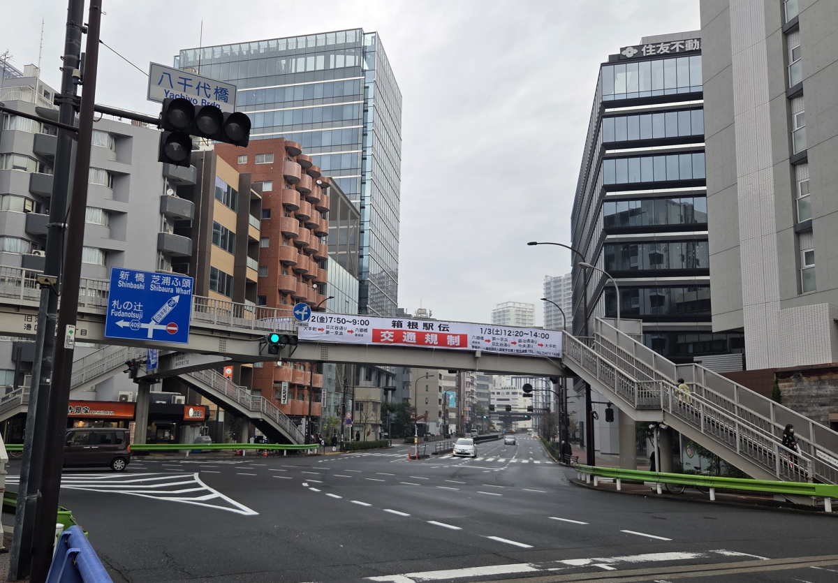 朝の散歩中にふと見上げると「箱根駅伝の道路規制」の横断幕が!!ぼーっと考え事しながら何気なく歩いて何気なく渡った八千代橋!?