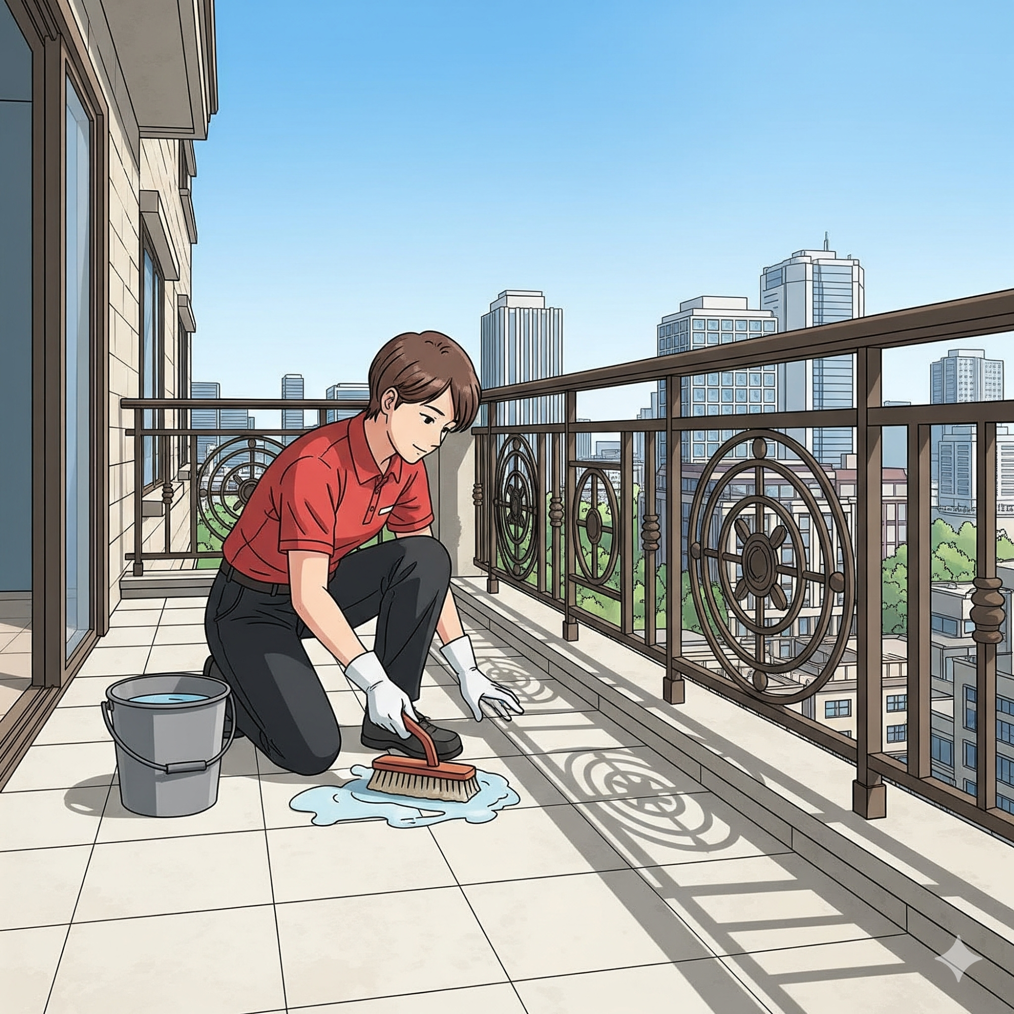 ゴムパッキンの黒カビや床面の赤カビは、専用のカビ取り剤とブラシで隅々まで洗浄。