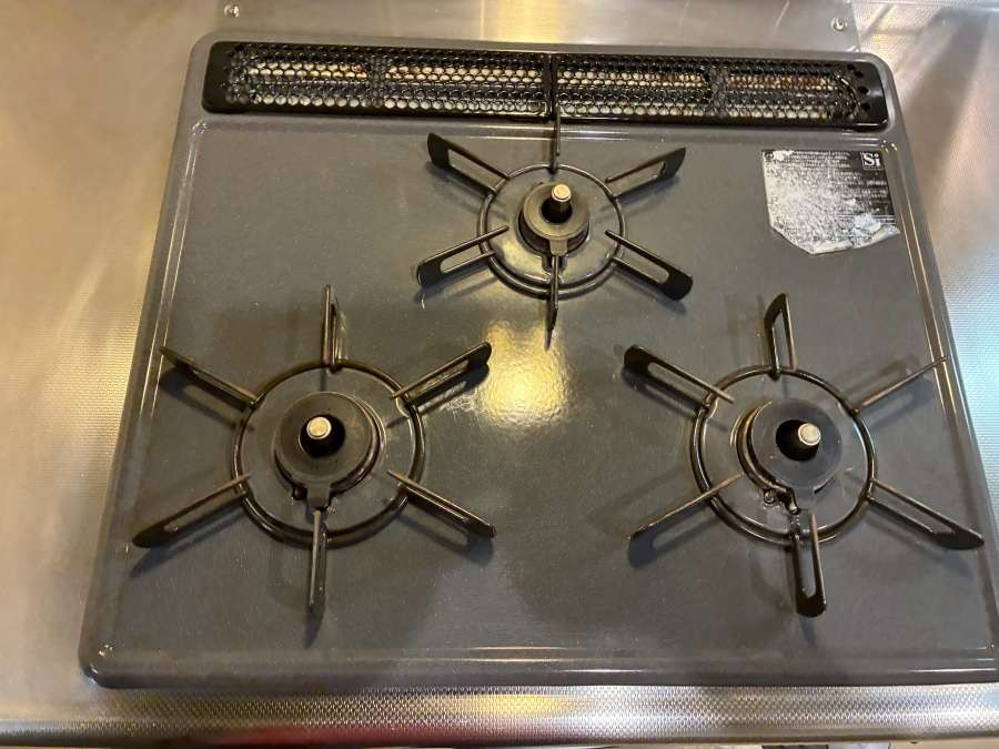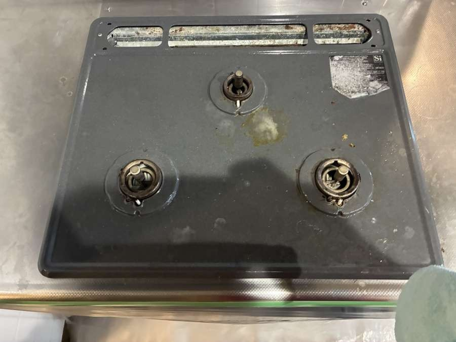 ① コンロ・壁面・作業台に付着した油汚れを重点的に清掃し、ベタつきをしっかり除去しました。