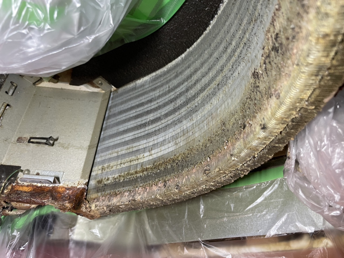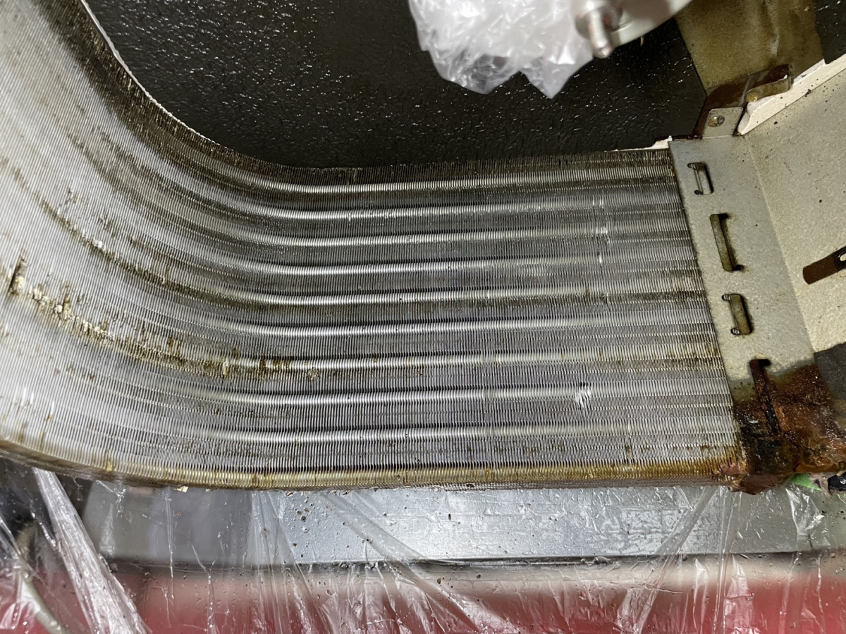 熱交フィンは、汚れで目詰まりしている状況・・・。Σ(oдΟ;)