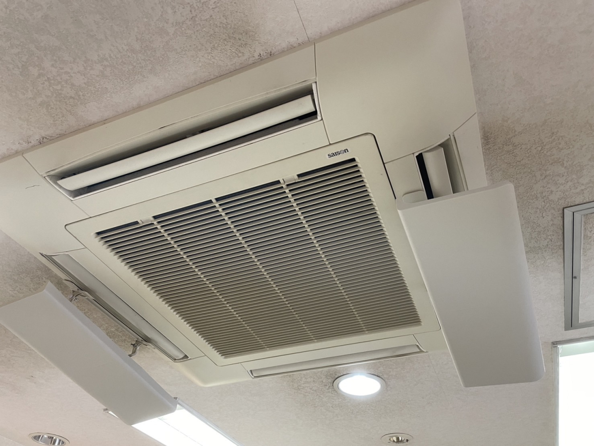 先日、事務所に設置されている「天井埋込カセット型エアコン(通称:天カセエアコン)」の清掃を行いました。