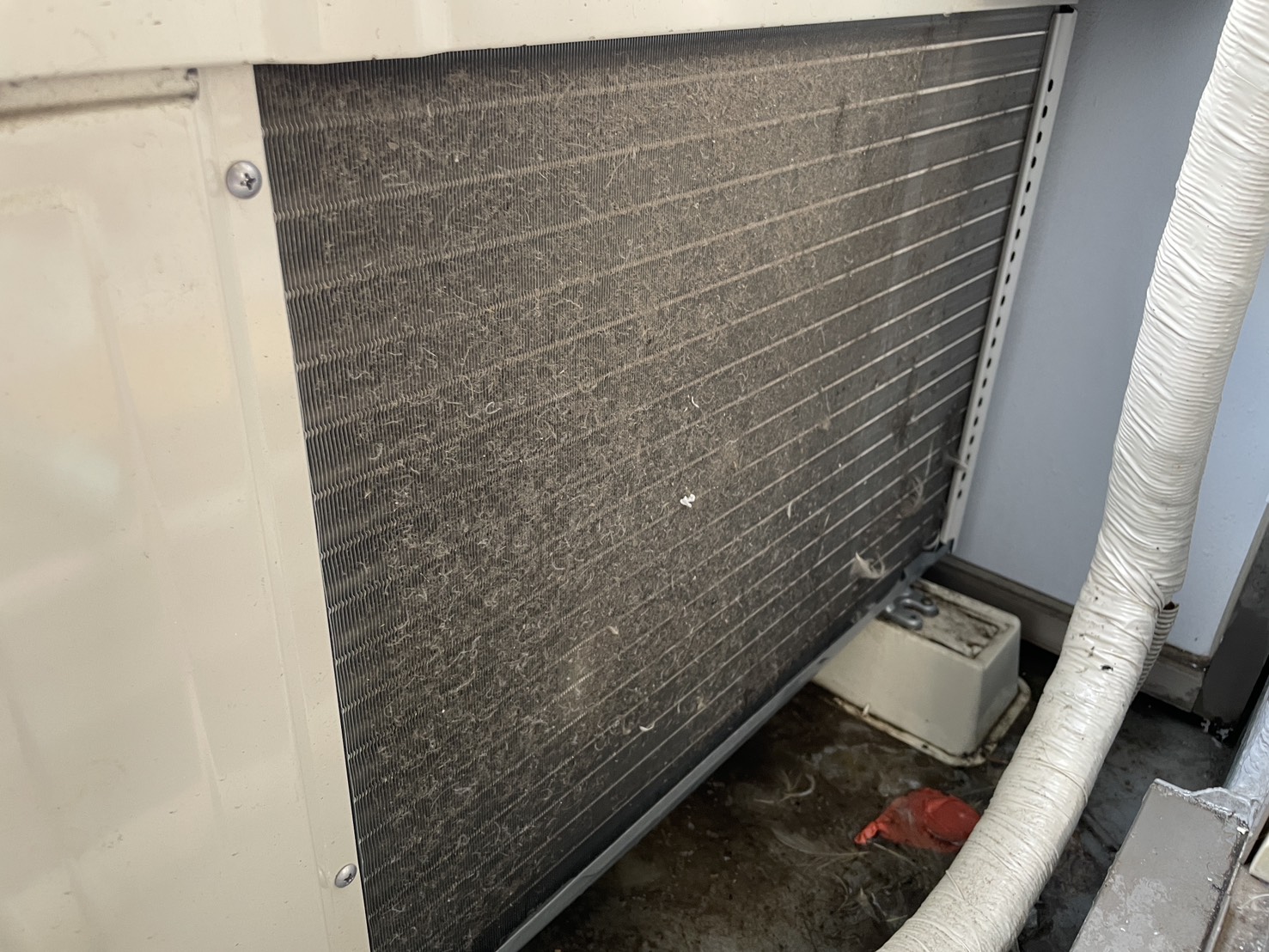 写真のように、室外機の背面(アルミフィン部分)には、外気のホコリ・排気ガス・花粉・小さなゴミなどが日々付着します。