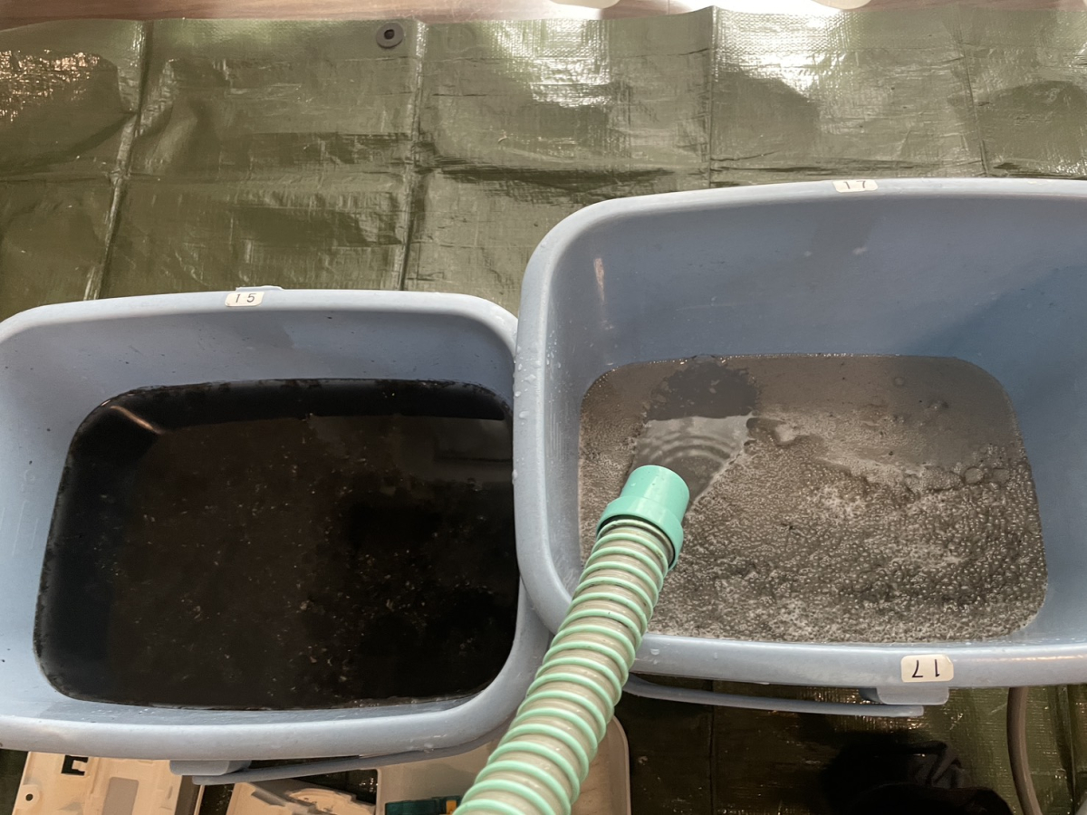 高圧洗浄機で汚れを落とすと、真っ黒な水がバケツへGO!