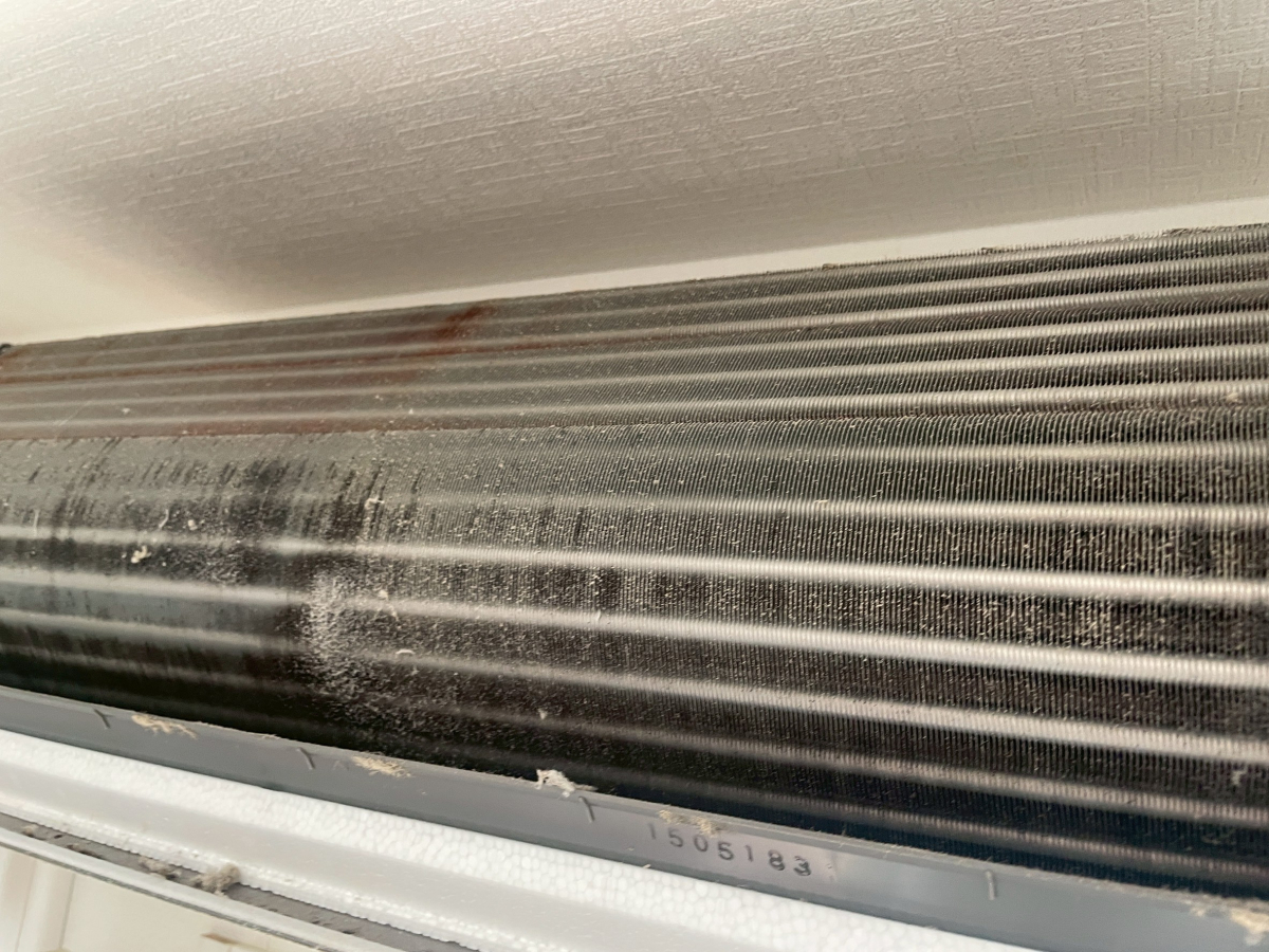 ファンやアルミフィン周辺にはホコリがしっかり付着し、手前の化粧パネルの内側にも細かな汚れが溜まっていました。