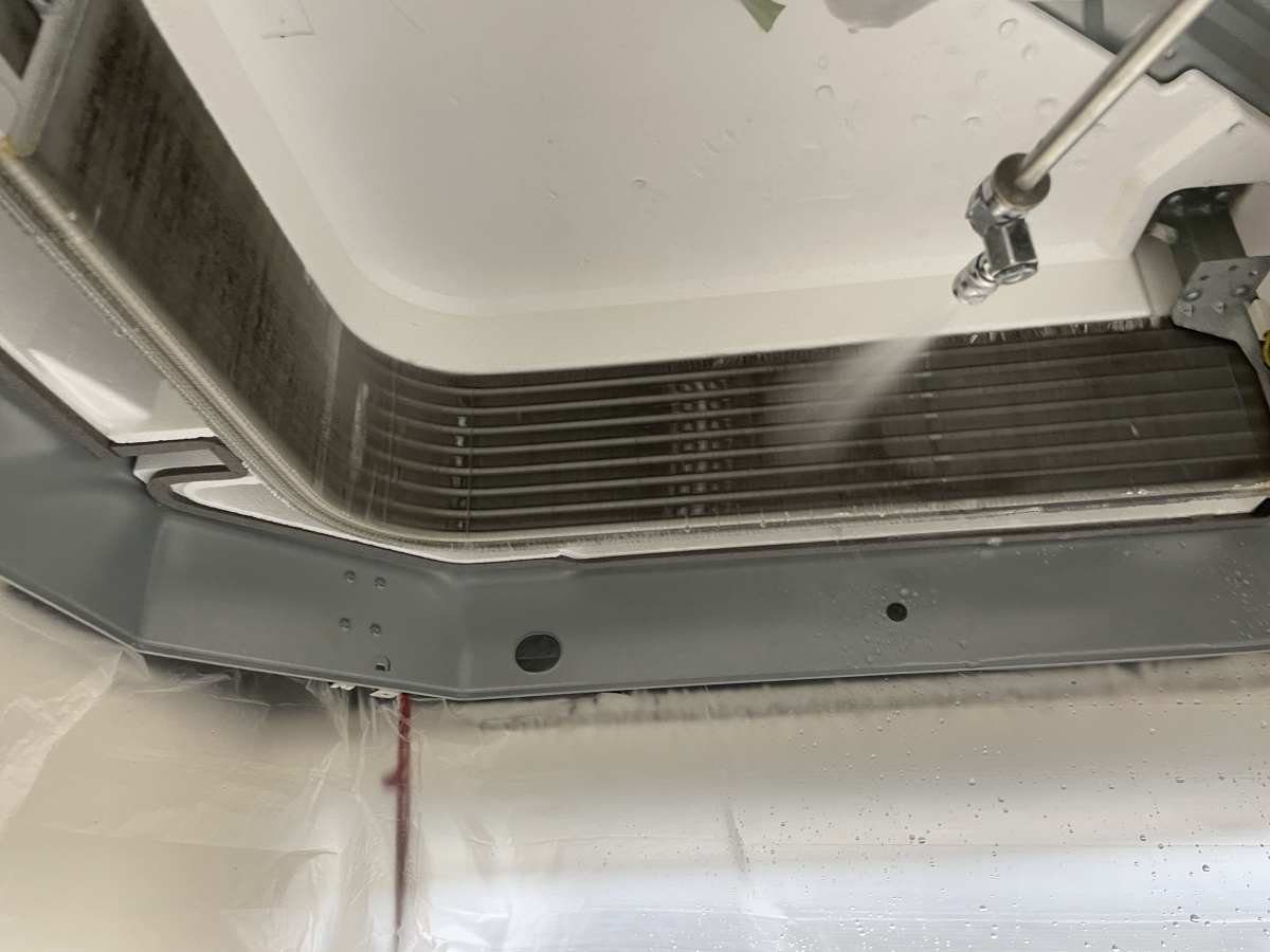 分解後は、内部の熱交換器や送風ファンなど、特に汚れが溜まりやすい箇所を中心に、専用の洗剤を使って丁寧に洗浄。