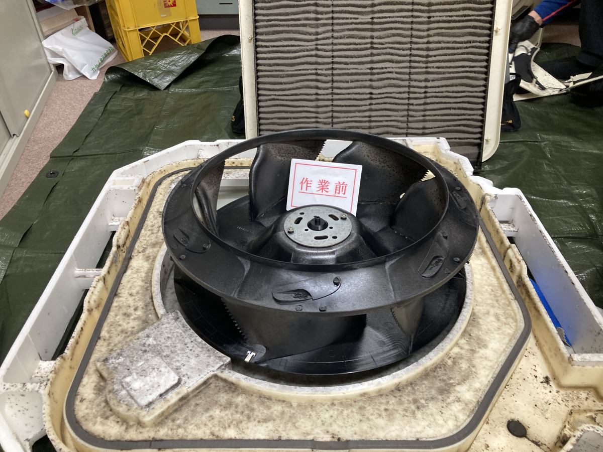今回の現場は事務所でしたが、さすが業務用エアコン。内部を確認すると、事務所特有のホコリや汚れがびっしりと付着していました。