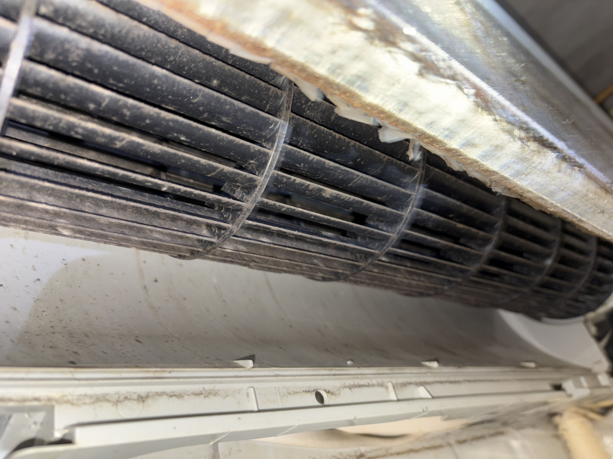 特に熱交換器やドレンパンには、油を含んだホコリやススが付着しやすく、それが固まることで排水の流れを妨げてしまいます。