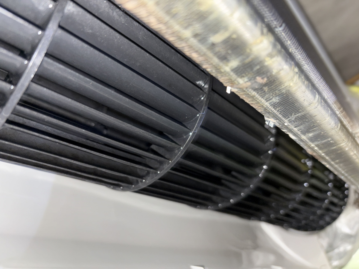 厨房は、一般のご家庭と比べて油煙や水蒸気が多く、エアコン内部が非常に汚れやすい環境です。