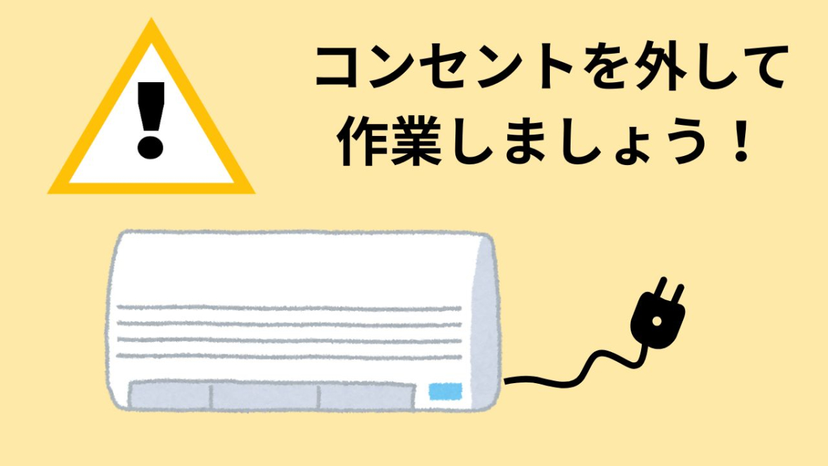 必ずエアコンの電源を切って、コンセントを外してから作業をしましょう。エアコンの電源が入ったまま作業すると、巻き込まれたり、怪我をする可能性があるので注意して下さい。前面のパネルを開けて、中にあるエアコンフィルターを取り出しましょう。爪で固定されているタイプの機種もあるので、無理に外さないようにして下さい。もし外れない場合は取扱説明書等を確認してください。