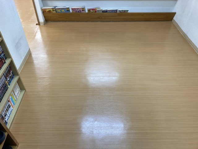 ここまで黒ずんでしまうと通常の床清掃ではキレイにする事ができないので、今回は古いワックスを剥がす、剥離作業をしてキレイにしました(^^)
