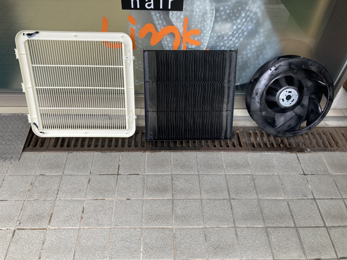 外したパーツは薬剤で水洗いし、エアコン本体は高圧洗浄機で洗っていきます(^^)