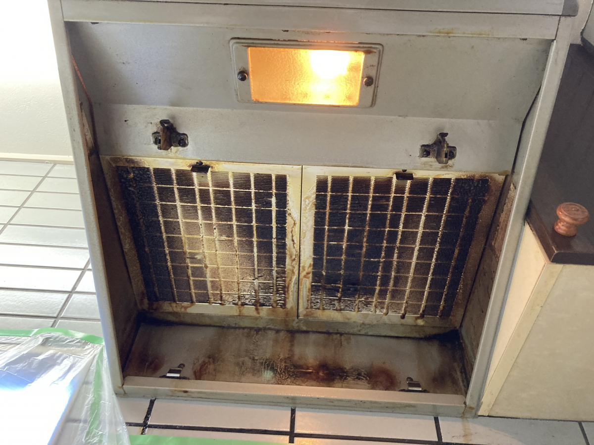 ハウスクリーニングの仕事を始めて3年になりますが、恐らく私が見てきたレンジフードの中でベスト5に入るぐらいの汚れです^^;笑