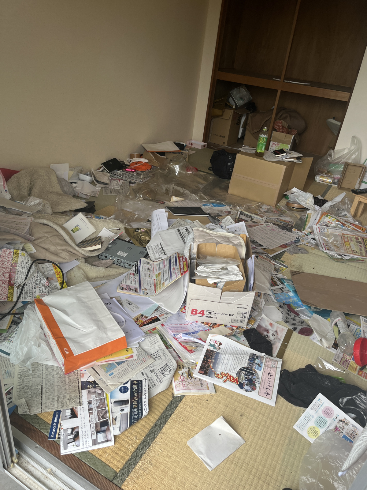3日後に不動産屋さんに部屋の明け渡しが既に決まっている。紙、プラスチック、電気製品、猫の餌や糞、2LDKの全ての部屋の荷物やそうしたゴミが折り重なって積みあがっていました。奥の部屋から手前に清掃作業を行うが、ベランダやお風呂場までゴミや段ボールでいっぱいでした。