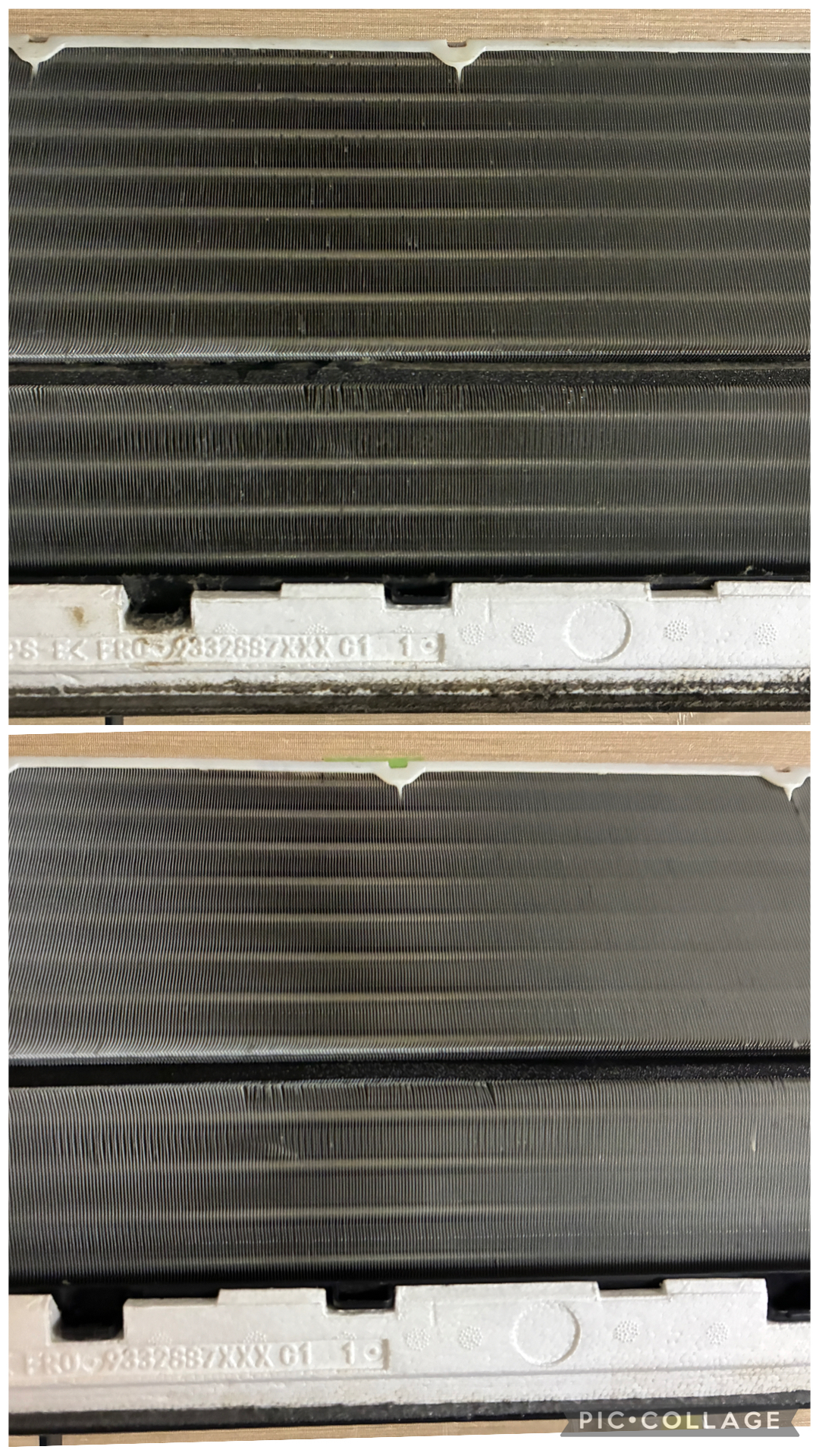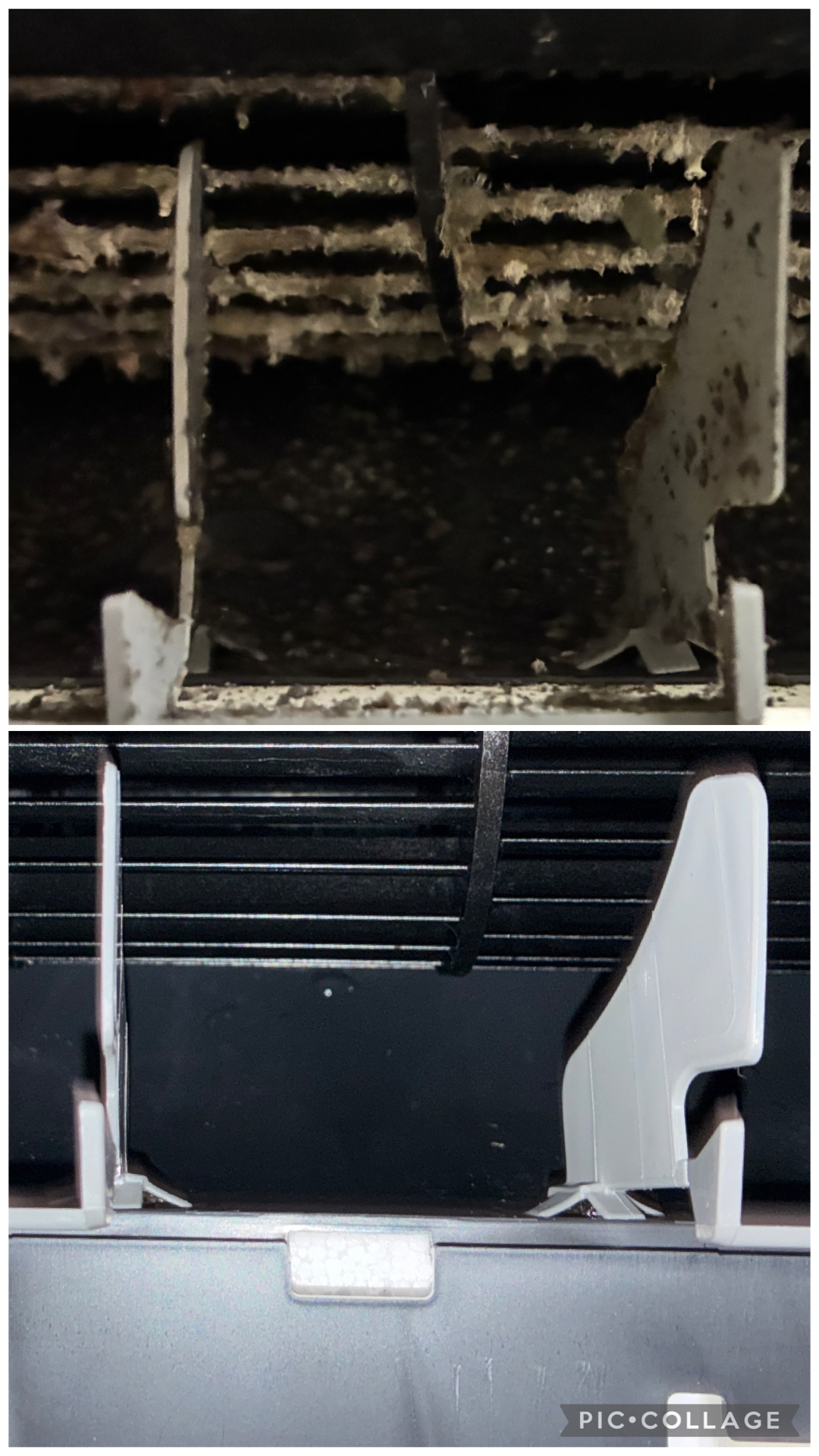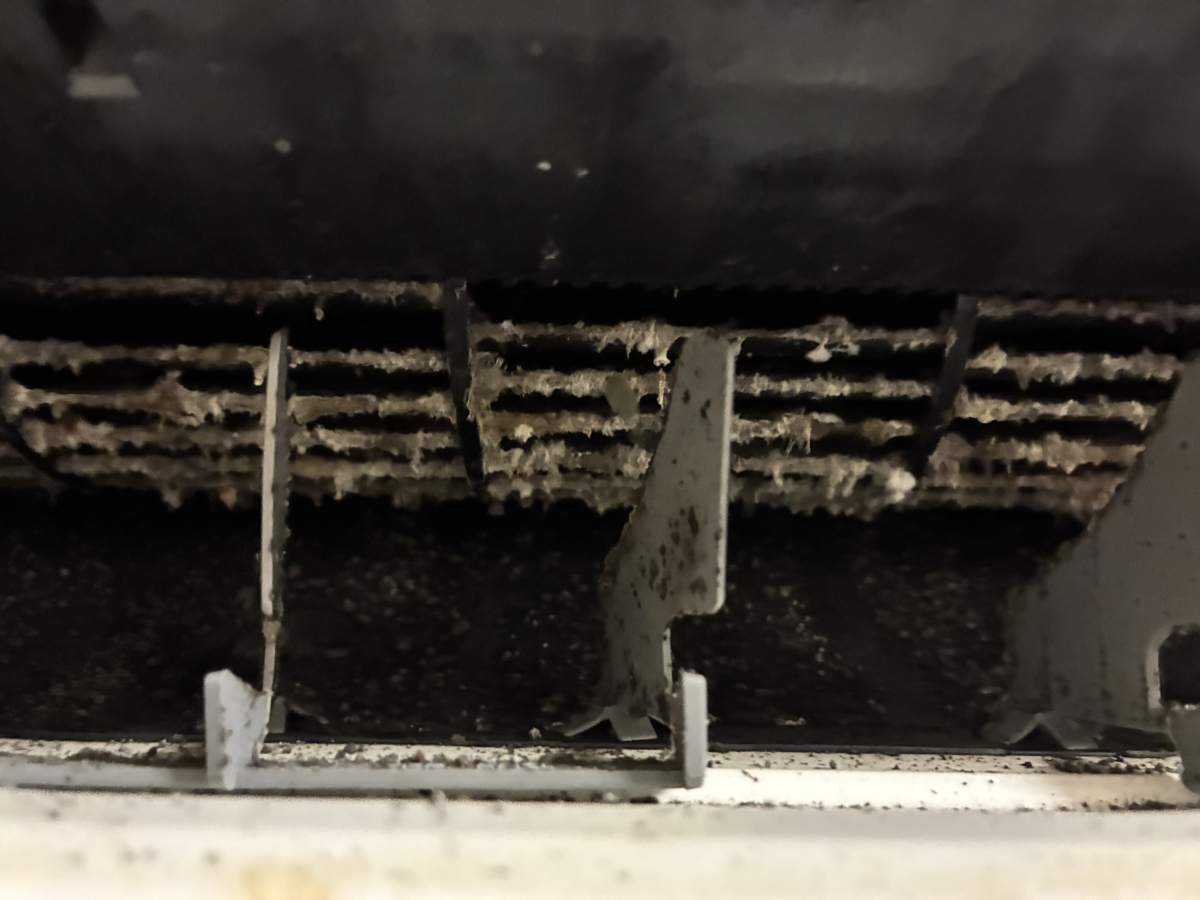薄汚れのアルミフィン(左)、ホコリだらけのファン(中)、カビで真っ黒だった背面(右)、すっきりキレイになりました!