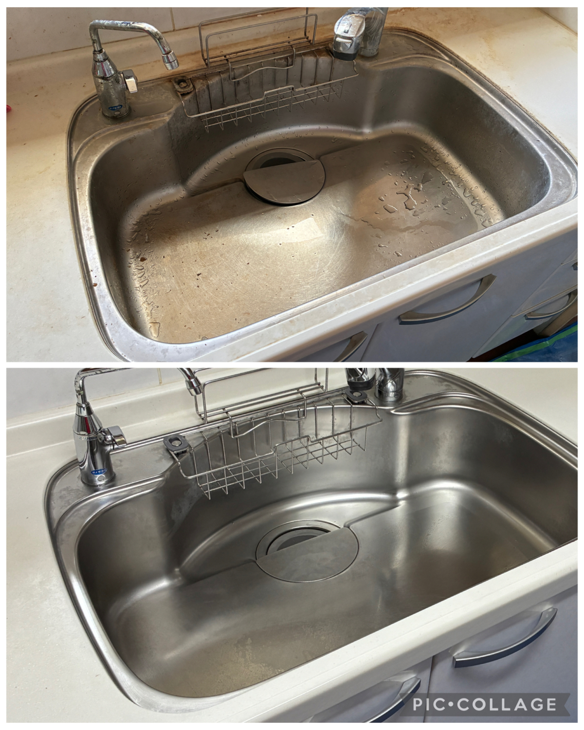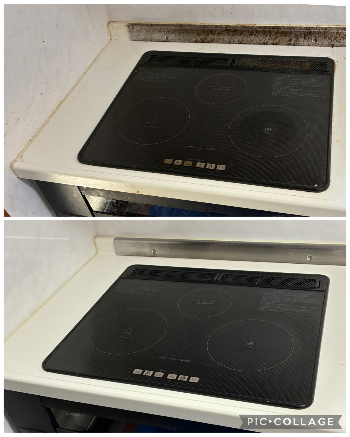 本日の作業では、レンジフード表面の油汚れ、内部ファンは取り外して付け置き洗い、IHコンロの焦げ落とし、シンク、カランの水垢落としなど、薬剤やパット、ブラシなどを適材適所で使用することで、スムーズに落とすことができ、キレイになりました!