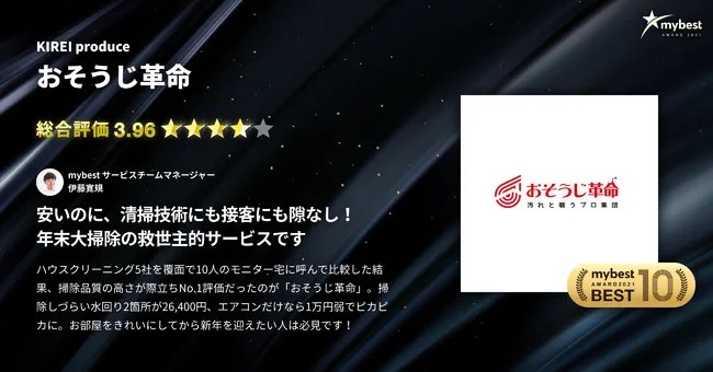 「mybest AWARD 2021」にて、 おそうじ革命がハウスクリーニング業界で唯一のベスト10に選ばれました! mybest こんばんは! おそうじ...