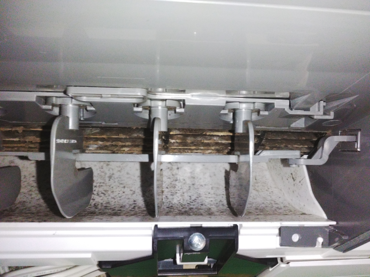 1年前にクリーニングを行っていたため、昨年ほどの凄い汚れではなかったですが、ファンには、油汚れとホコリ、吹き出し口にはカビ汚れがありました。