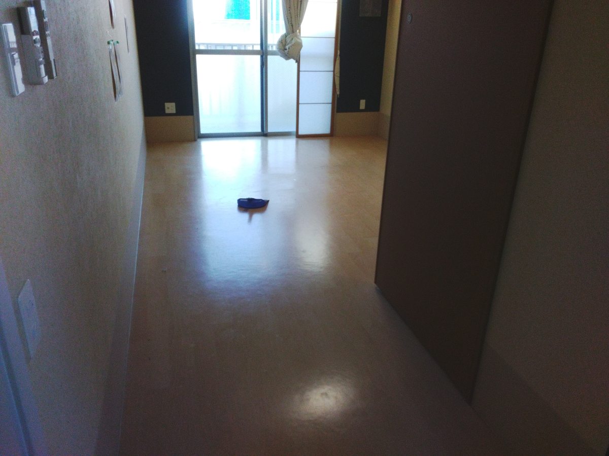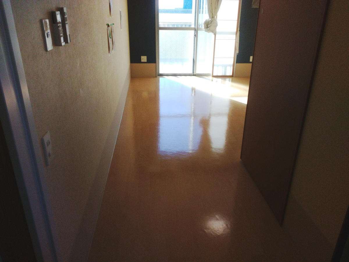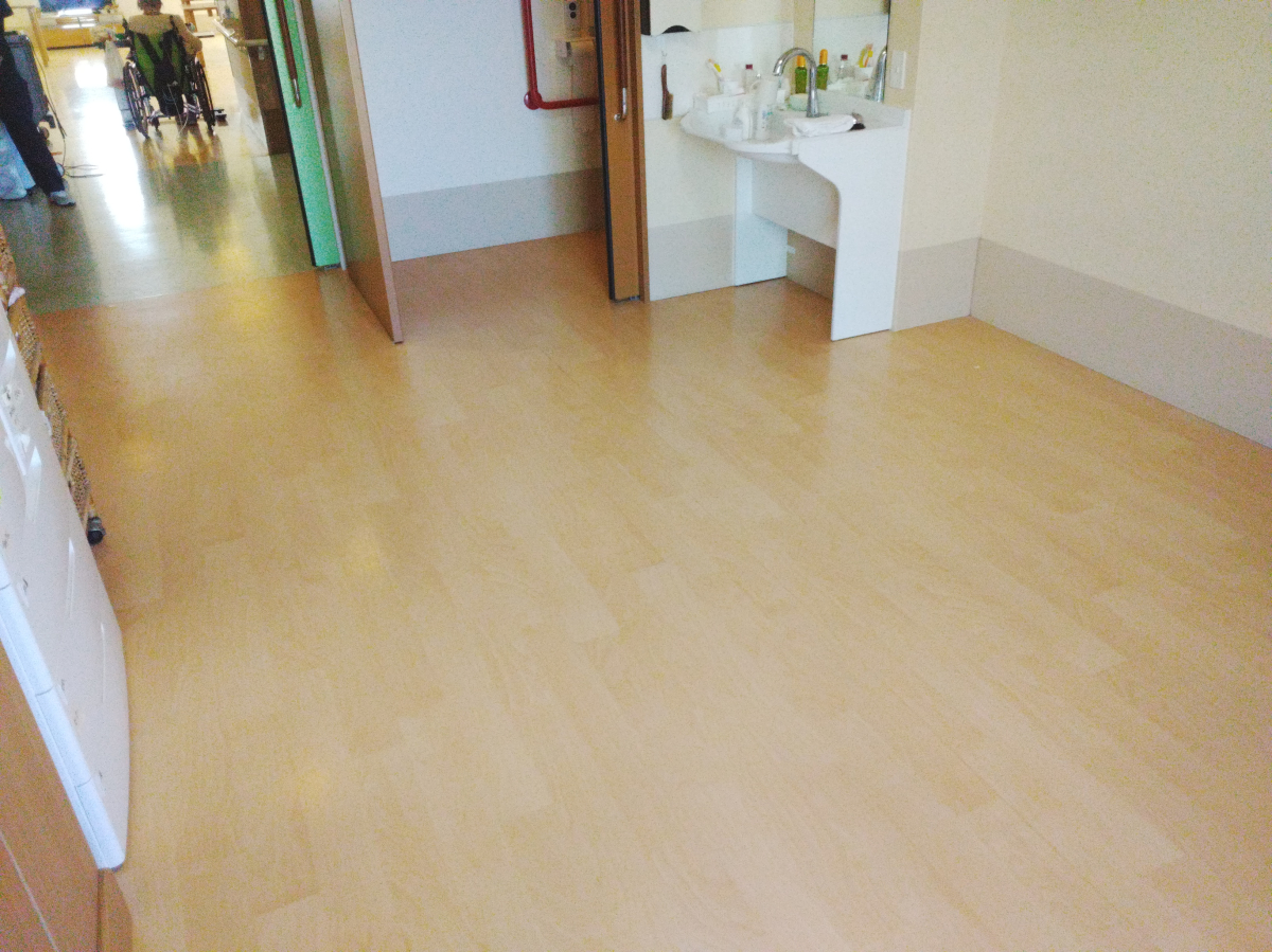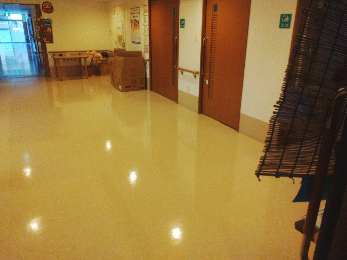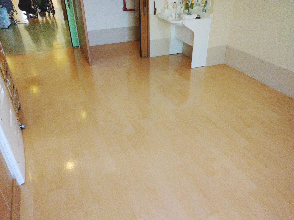 今回居室、エレベーターホールの一部は、ポリッシャー使用後にワックスを塗布させて頂きました。