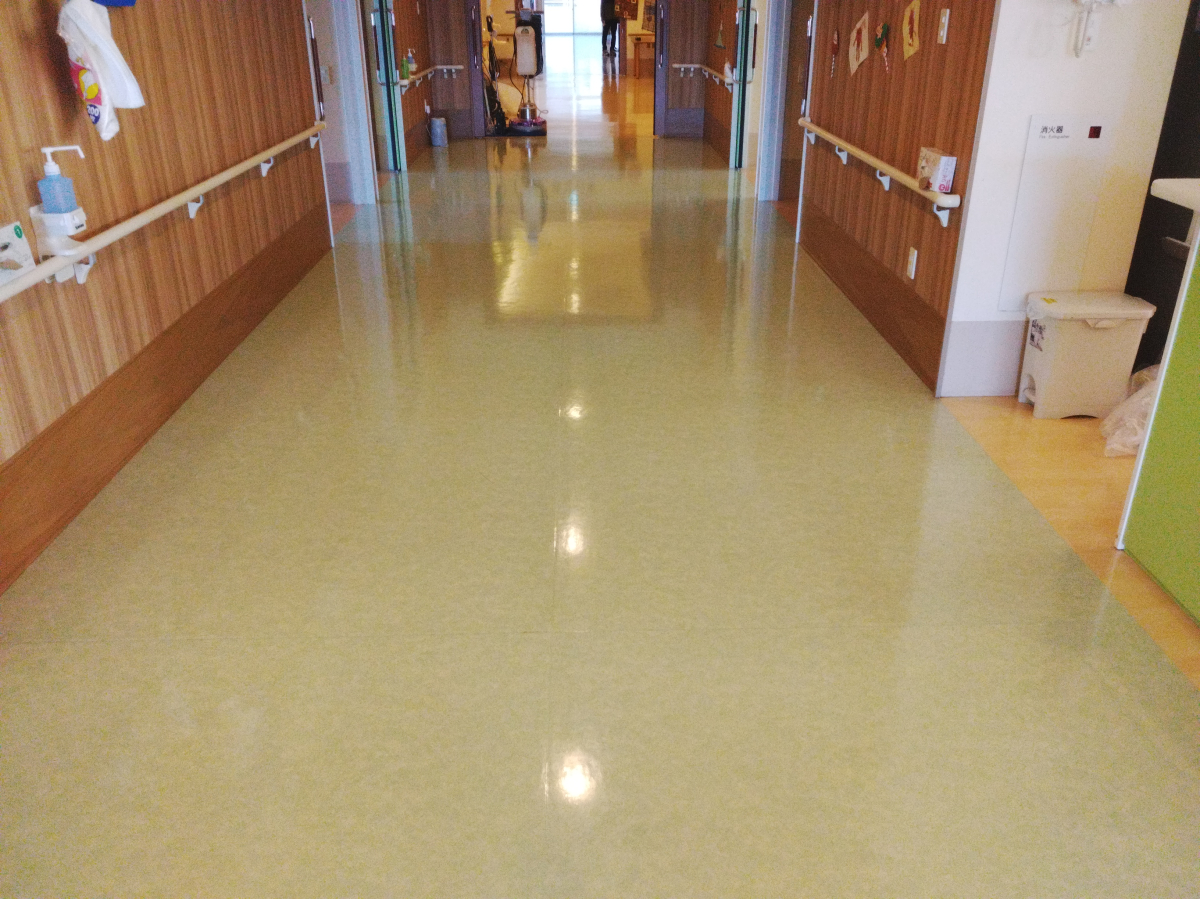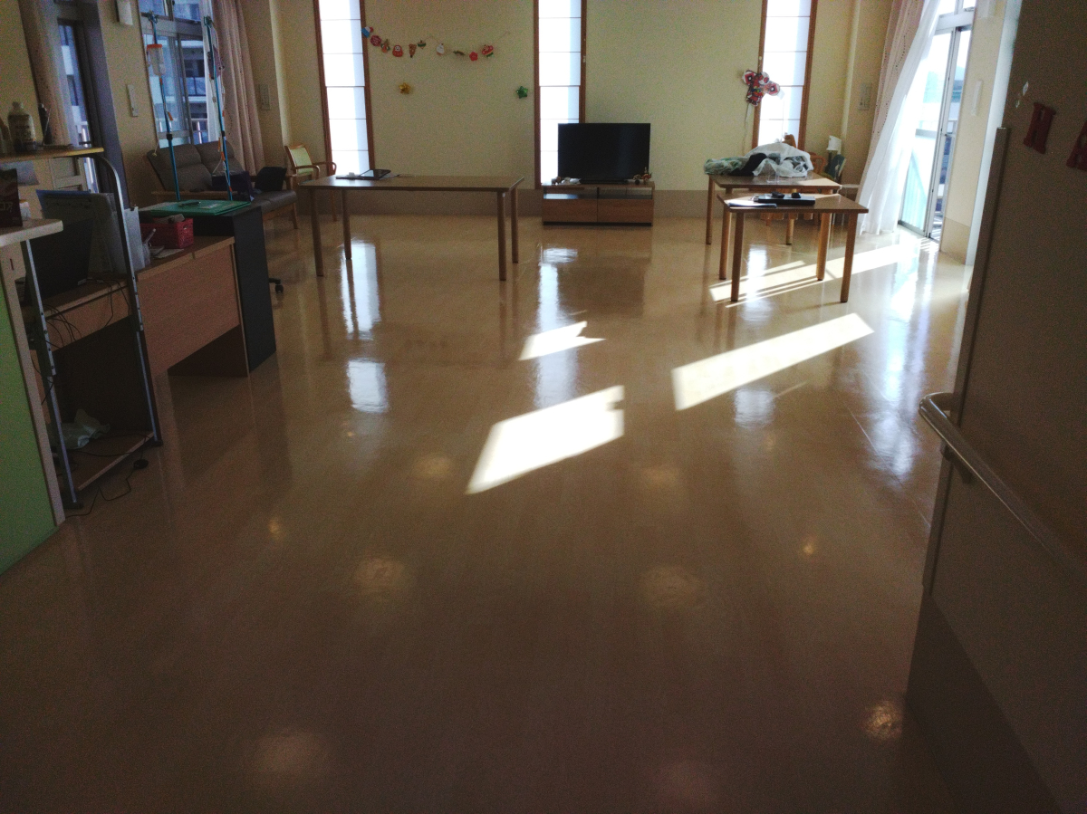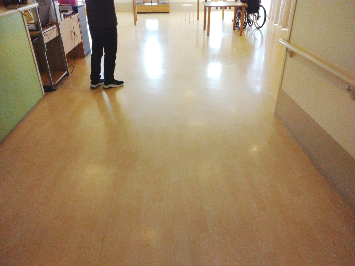 居室、食堂、廊下は、ポリッシャー使用後にワックスを塗布させて頂きました。