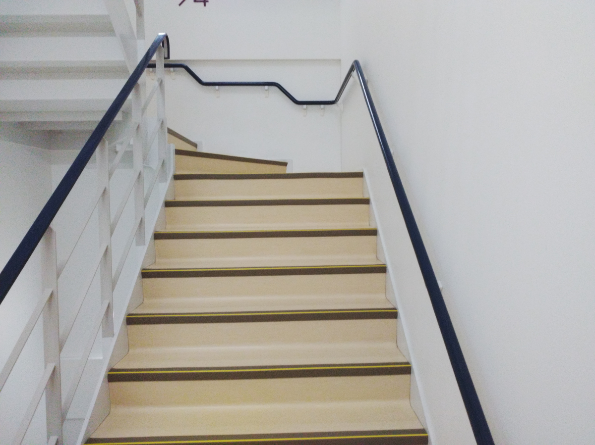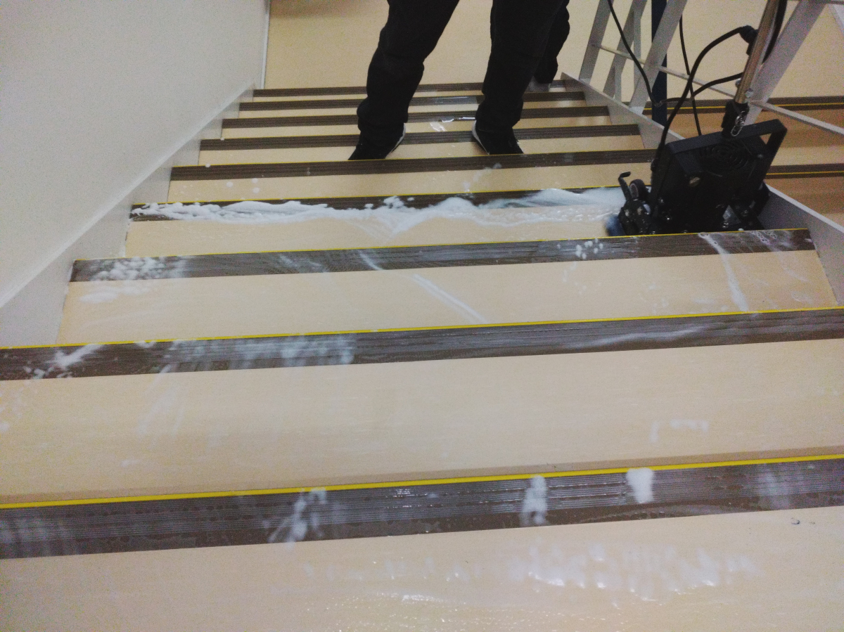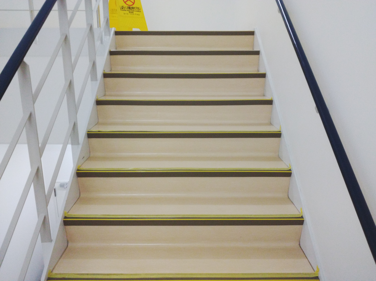 非常階段は、小さめのポリッシャーで対応させて頂き、その後ワックスをかけさせていただきました。