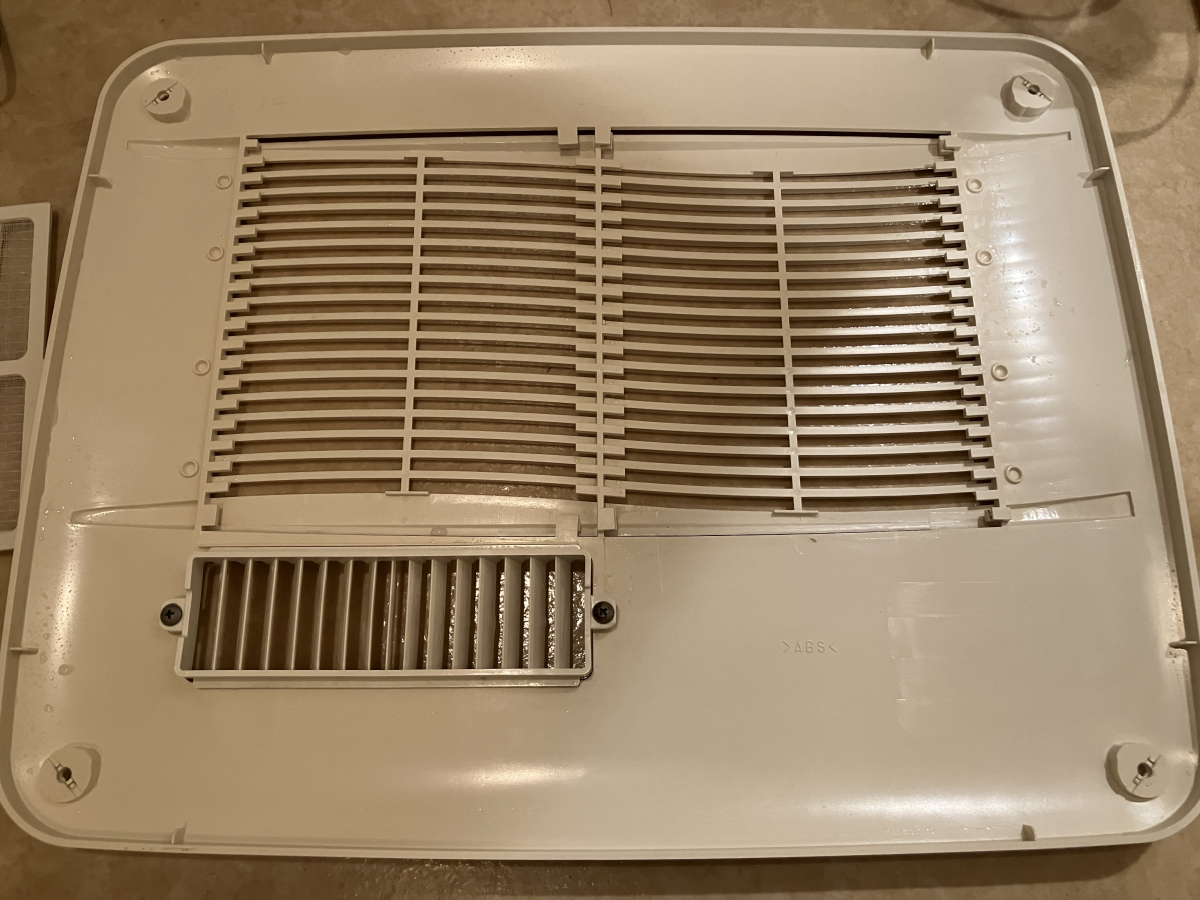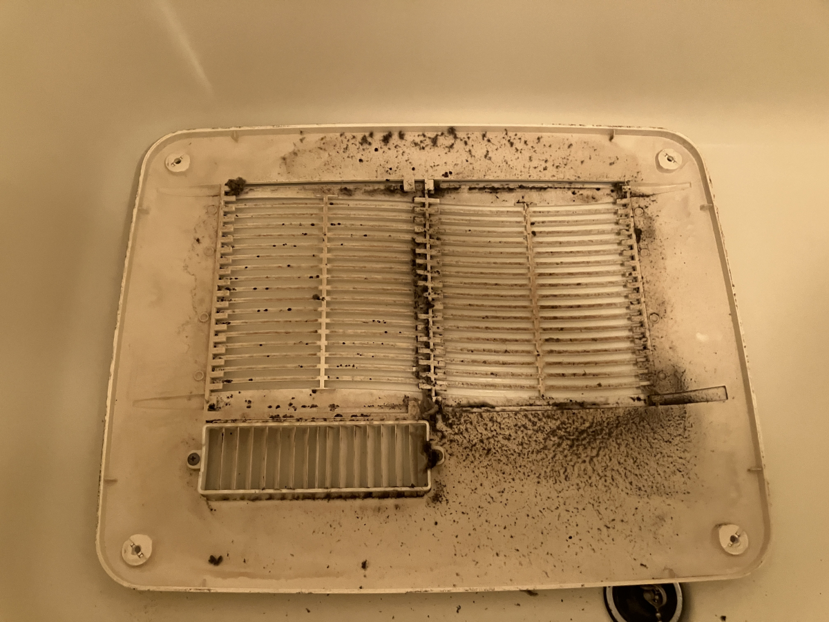表面カバーの裏側は黒い汚れが大量に付着しています、こちらはほこりに黒カビが繁殖して付着している状態です。