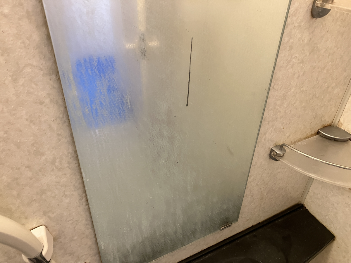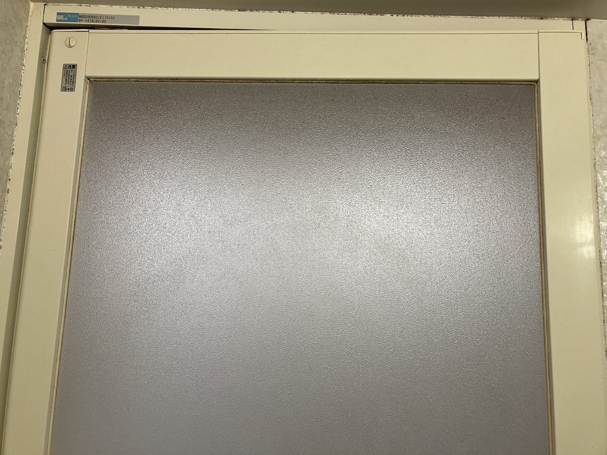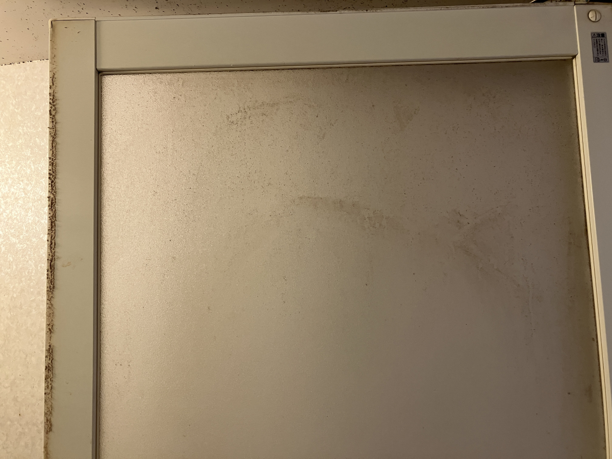 浴室扉も汚れが付きやすい部分になります、腰から上はほこり汚れとカビ汚れが広範囲に付着しています。
