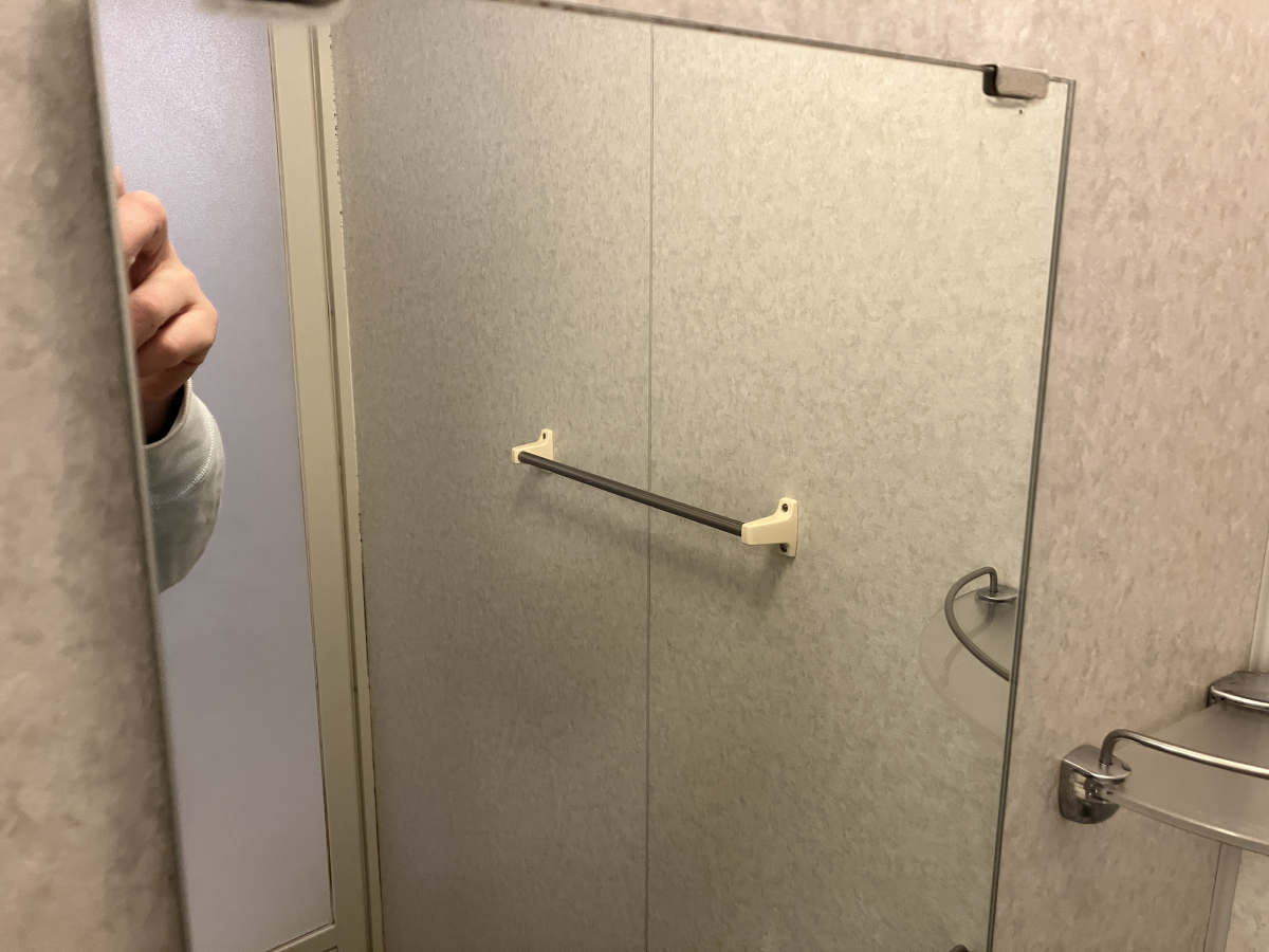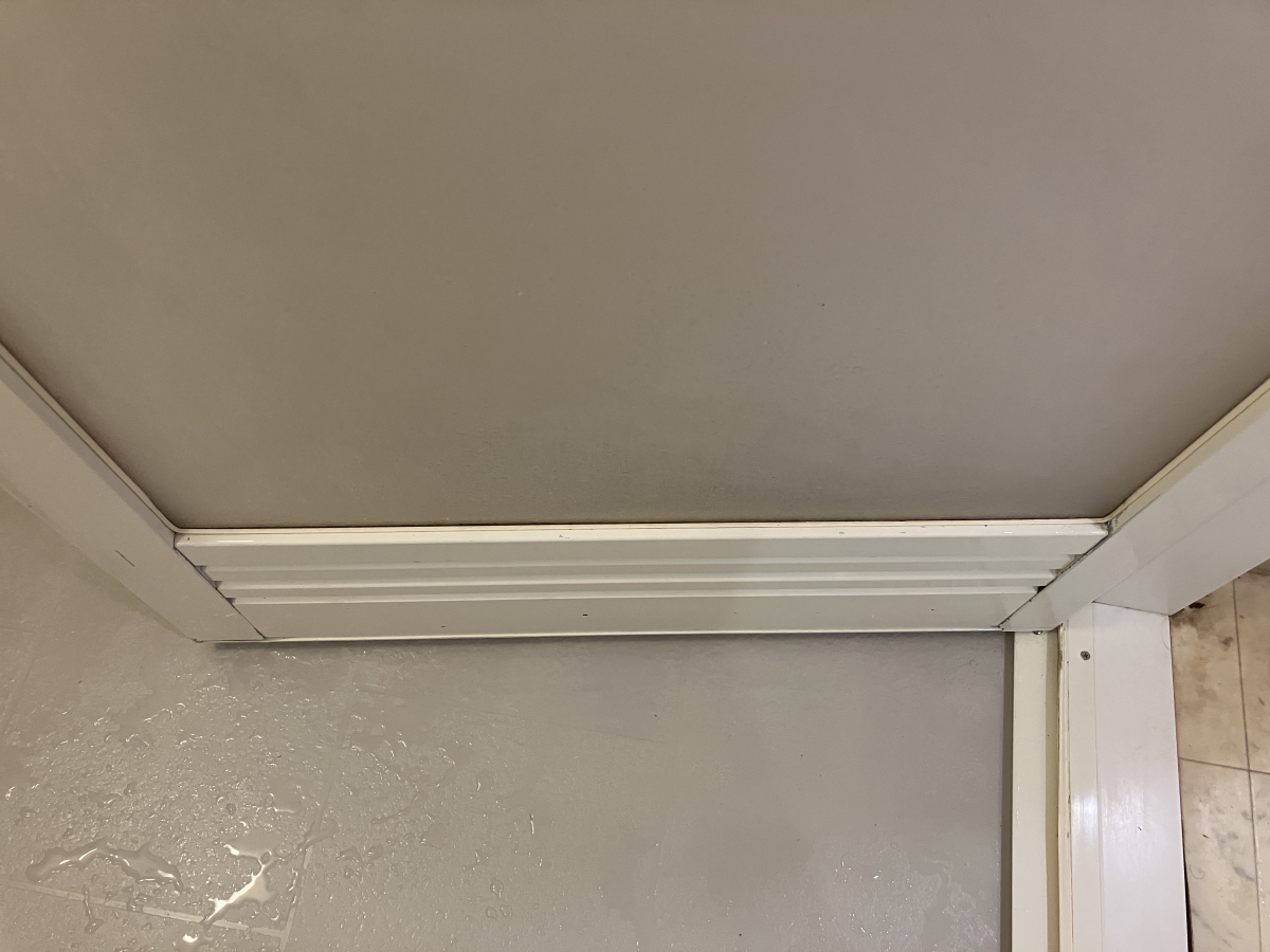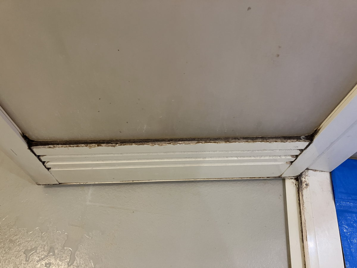 浴室扉も汚れが付きやすい部分になります、腰から上はほこり汚れとカビ汚れが広範囲に付着しています。